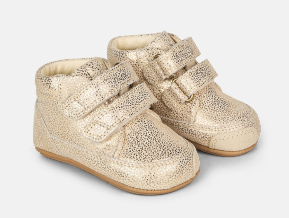 Prewalker i skind i en guldfarvet glitter nuance fra Bundgaard. Bundgaard prewalkeren er en klassisk sko designet til at give de mindste god komfort og støtte, når de tager deres første skridt. Den er fremstillet i LWG-certificeret læder og har en blød, meget fleksibel gummisål. Indersålen er ligeledes blød og behagelig for små fødder.
