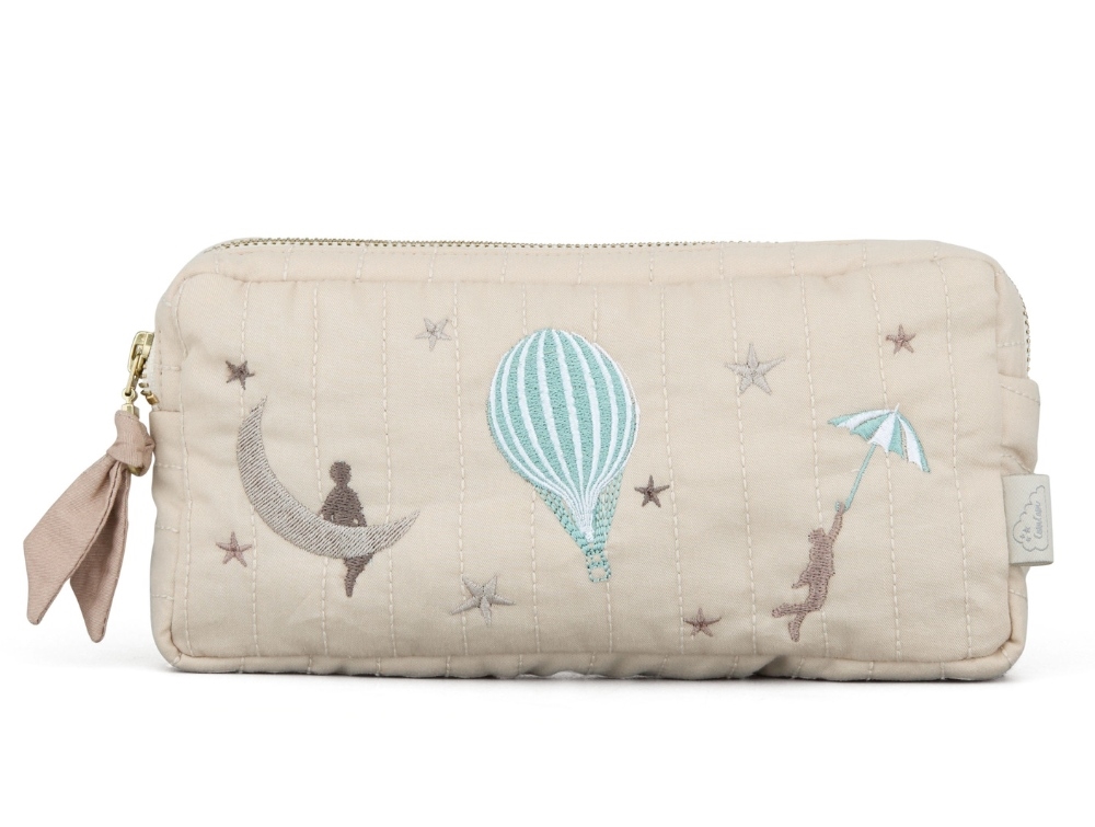 Penalhus i beige nuance fra Cam Cam Copenhagen. Fremstillet i quiltet, økologisk bomuldssatin med fine broderier inspireret af Dreamland-universet – ballon, måne og dreng med paraply.