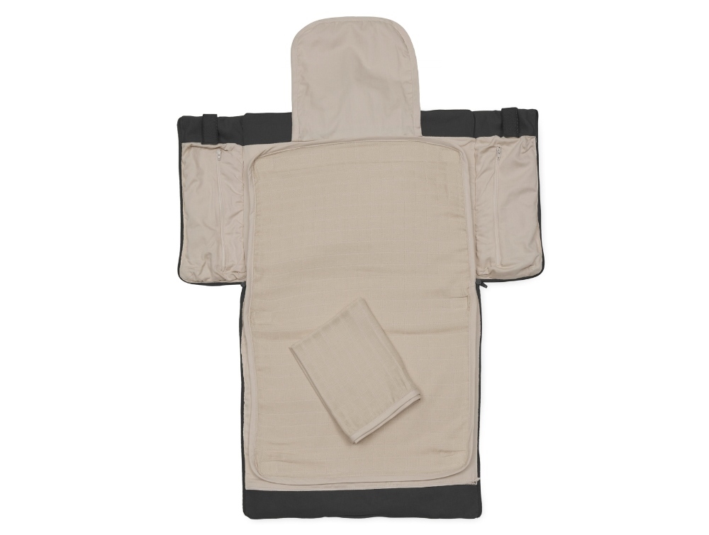 Pusletaske i sort nuance fra Cam Cam Copenhagen. Tasken er fremstillet i kraftig økologisk bomuldscanvas og designet til forældre, der ønsker funktion og stil i ét. Tasken foldes ud til et fuldt pusleunderlag, som samtidig kan anvendes som lille legetæppe.
