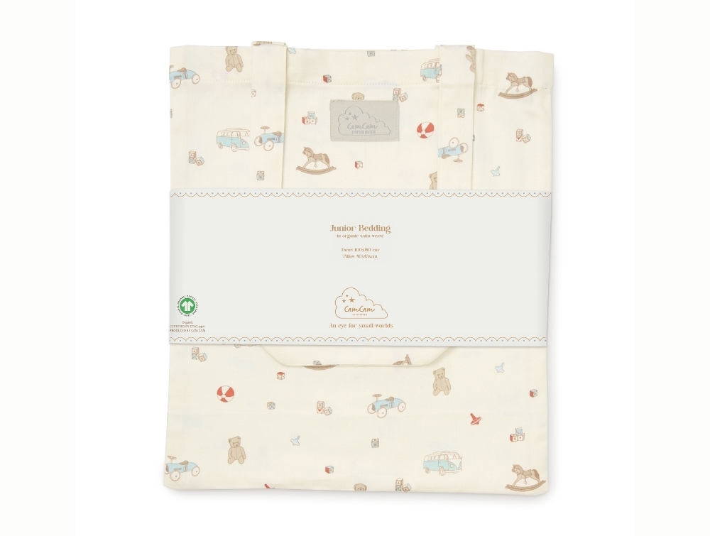 Juniorsengetøj i råhvid nuance med vintage toys print fra Cam Cam Copenhagen.