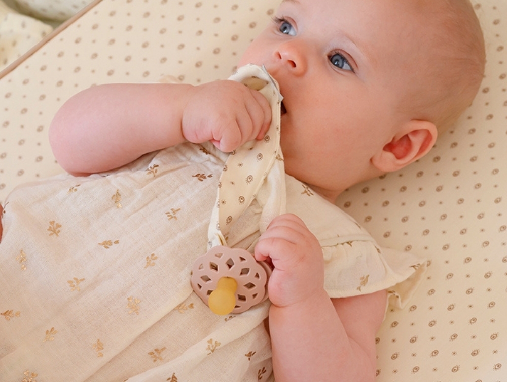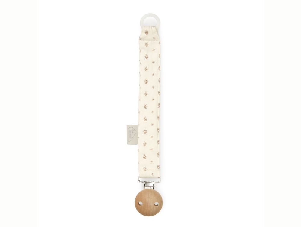 Cam Cam Copenhagen suttesnor i råhvid nuance med rowan print og træclipCam Cam Copenhagen suttesnor i brug med rowan print