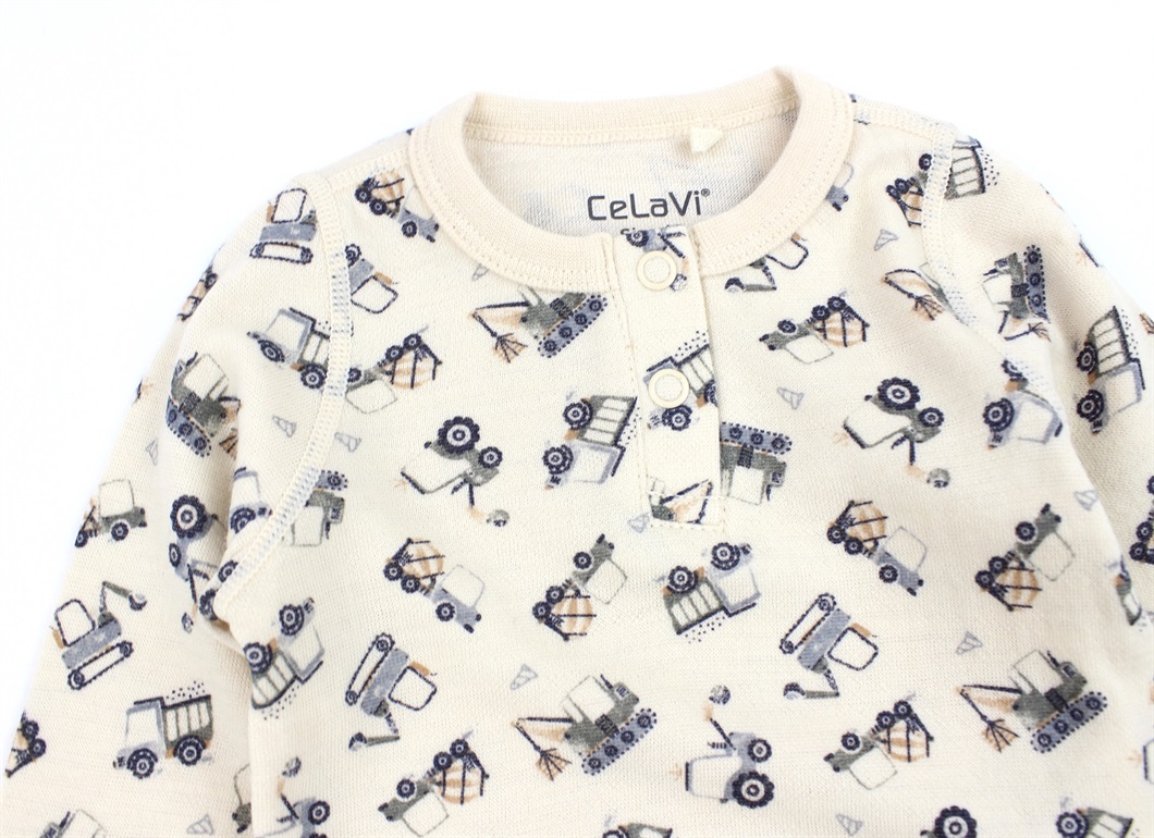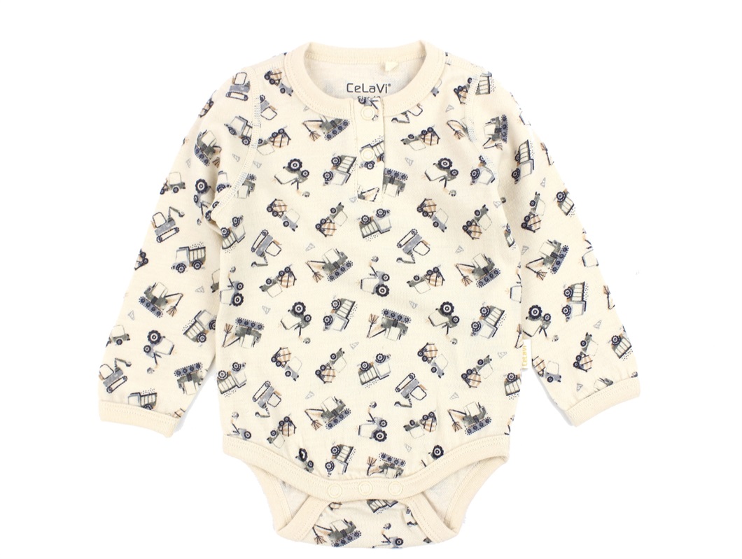 Der er et sødt print af traktorer og maskiner på bodyen.