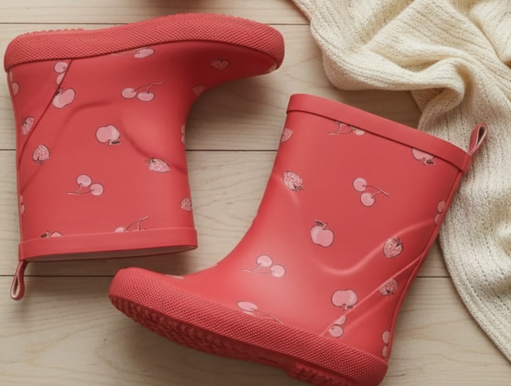 Fin gummistøvle fra CeLaVi i rødlig cayenne med sødt frugtprint af kirsebær, jordbær og æbler.