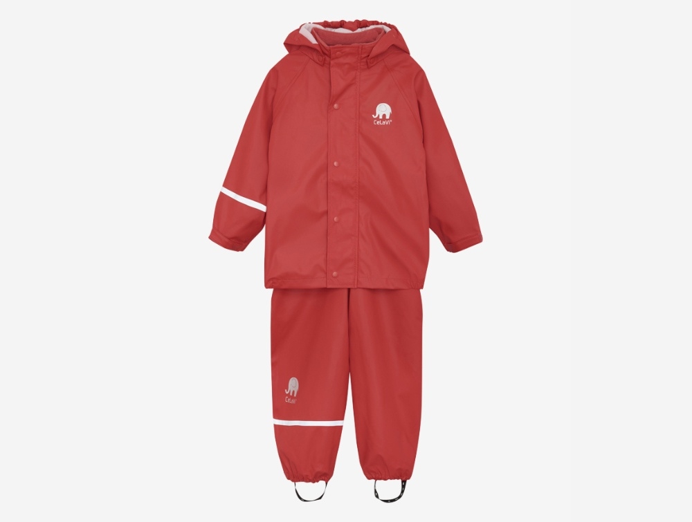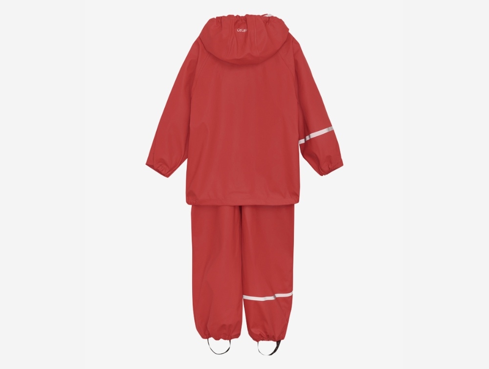 CeLaVi regnsæt i rød nuance er et praktisk sæt til regnfulde dage med regnjakke og regnbukser i et enkelt design. Sættet har en glat overflade med gummiagtig PU-belægning, refleksdetaljer og en almindelig pasform, der giver god bevægelsesfrihed under leg i vådt vejr.