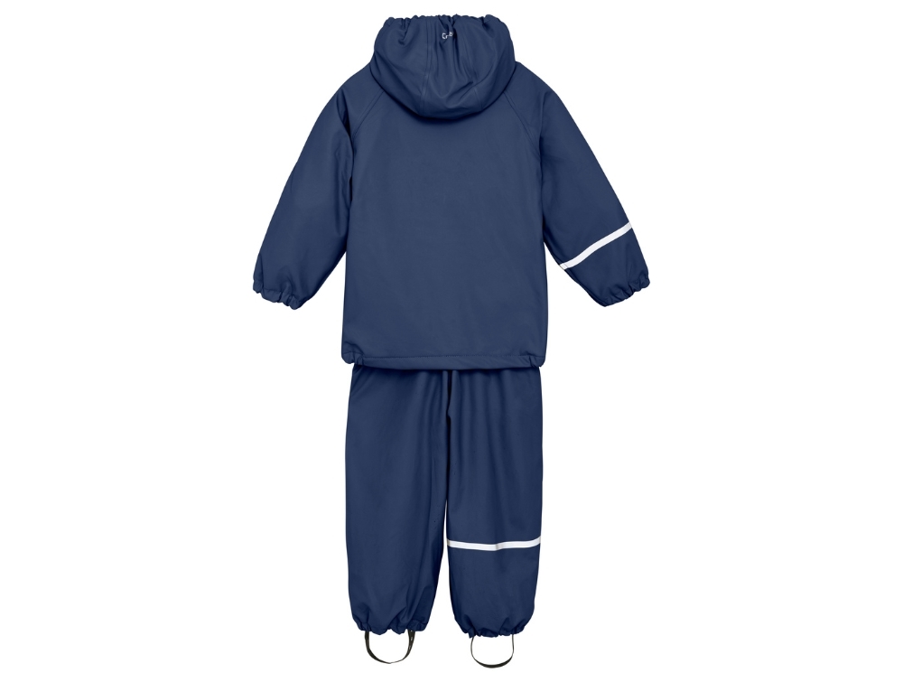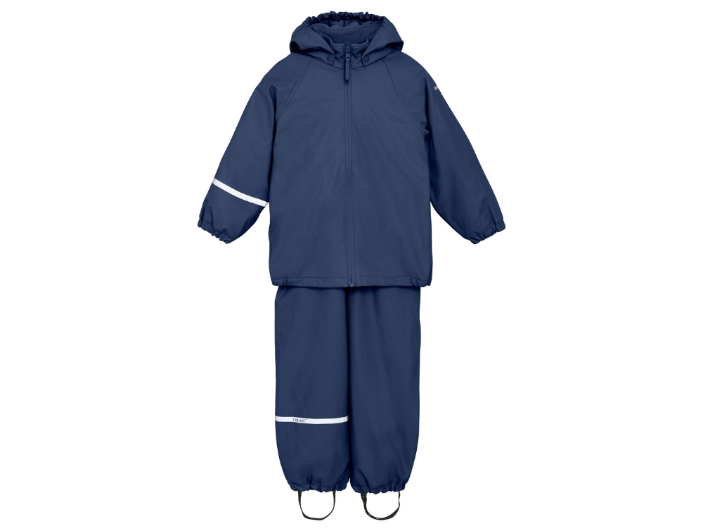 CeLaVi regnsættet har en aftagelig hætte, refleksstriber på ærmer og bukseben samt et blødt fleecefoer, som gør det ekstra egnet til koldt vejr. Bukserne har elastik ved anklerne og aftagelige fodstropper. Bemærk, at bukserne har seler op til og med størrelse 100 – fra størrelse 110 og op er der elastik i taljen og ingen seler.