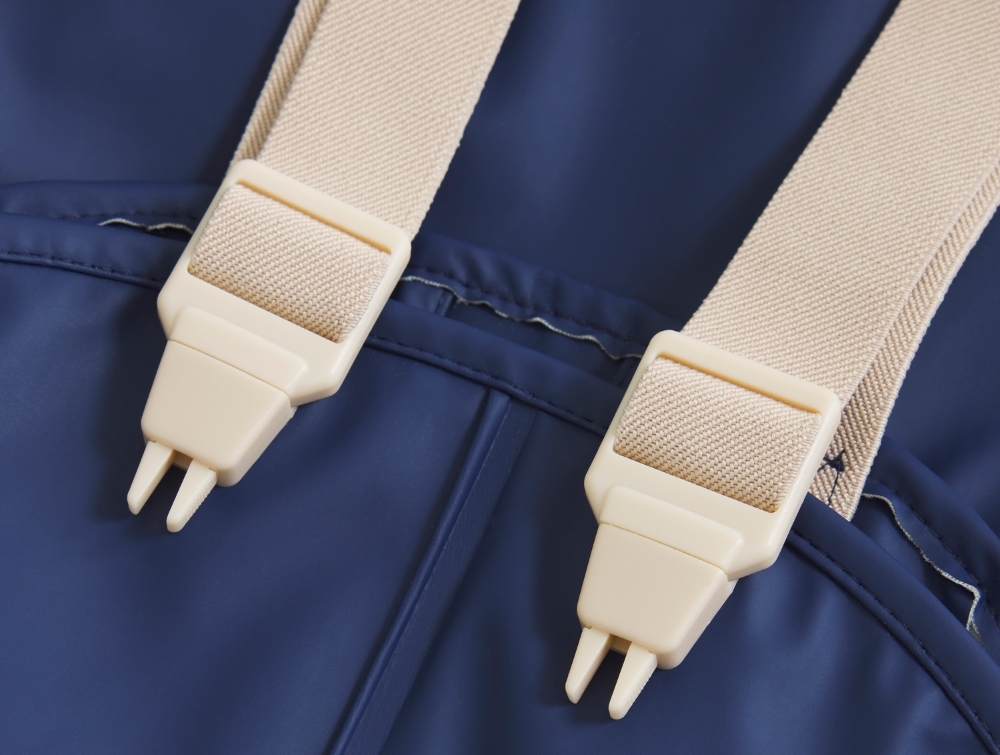 Jakken lukkes med vandtæt lynlås og har en aftagelig hætte, som fastgøres med trykknapper. Der er refleksdetaljer på ærme og ben samt elastikkanter ved hætte, talje og ærmer for en bedre pasform. Bukserne har justerbare seler med klikspænder op til str. 110, og derefter elastik i taljen. Under fødderne er der justerbare stropper, som holder bukserne sikkert på plads.