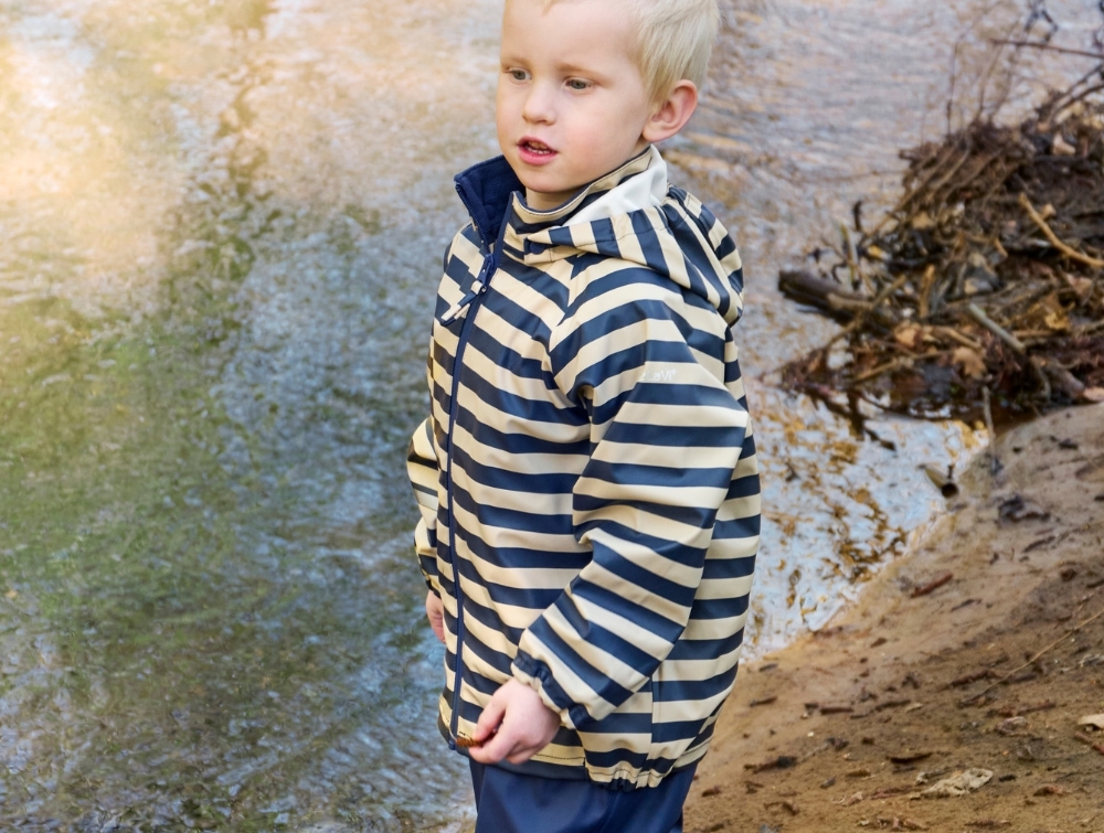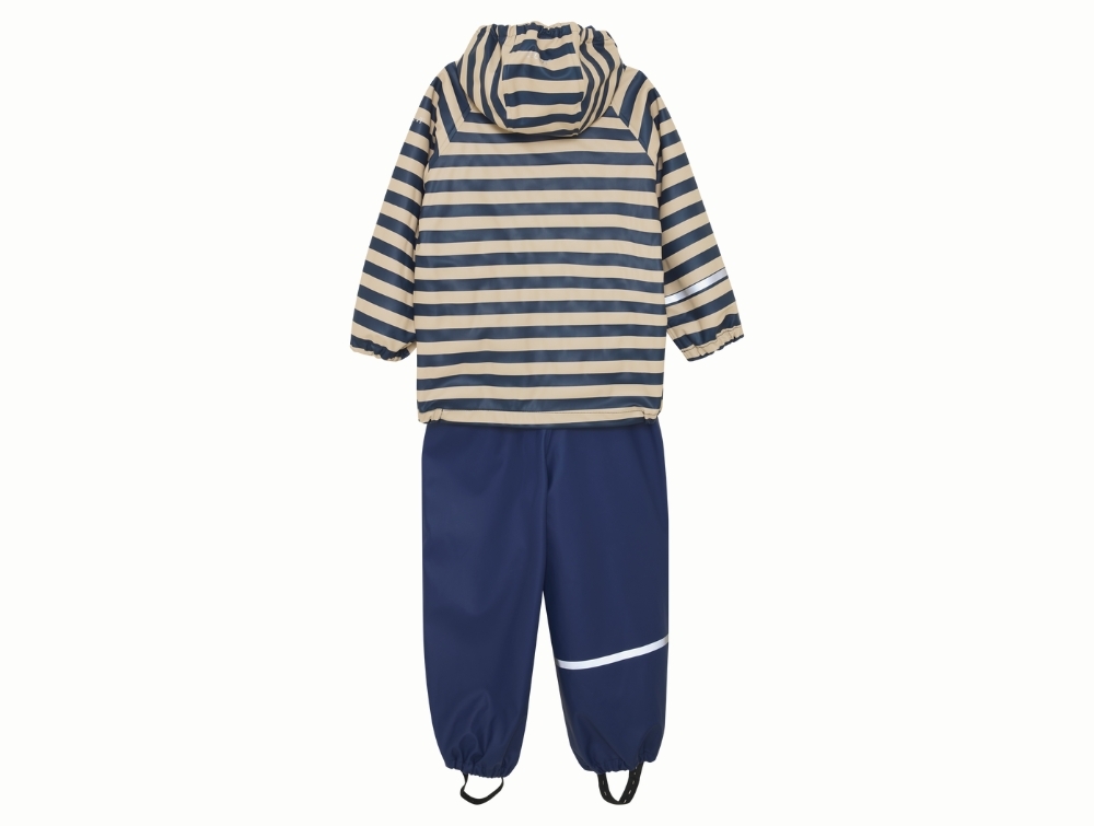 Sættet består af en beige og blåstribet regnjakke og ensfarvede blå regnbukser i blød, vandtæt PU-kvalitet. Et praktisk sæt til udendørs leg, som beskytter barnet mod regn og vind.