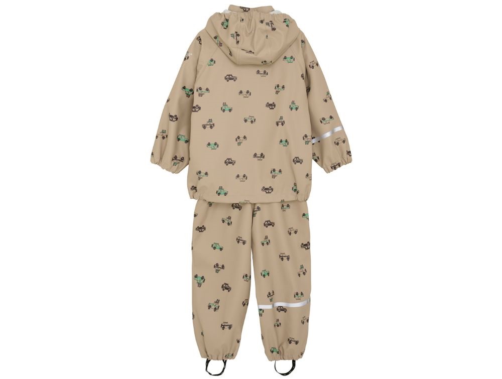 Beige regnsæt fra CeLaVi med print af små biler og refleksdetaljer på ærmer, ben og hætte.