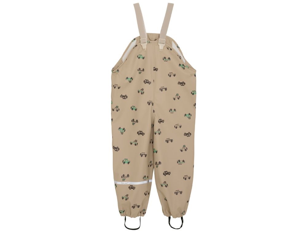 celavi regnsæt i beige med bilprint og refleksdetaljer, set forfracelavi regnsæt i beige med biler og hætte, set bagfracelavi regnbukser med sele og bilprint, set bagfranærbillede af refleksbånd og bilprint på regntøj fra celavinærbillede af sele og detalje på beige regnsæt fra celavi