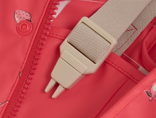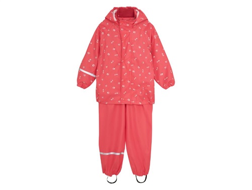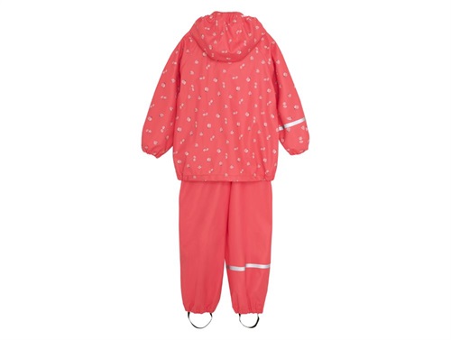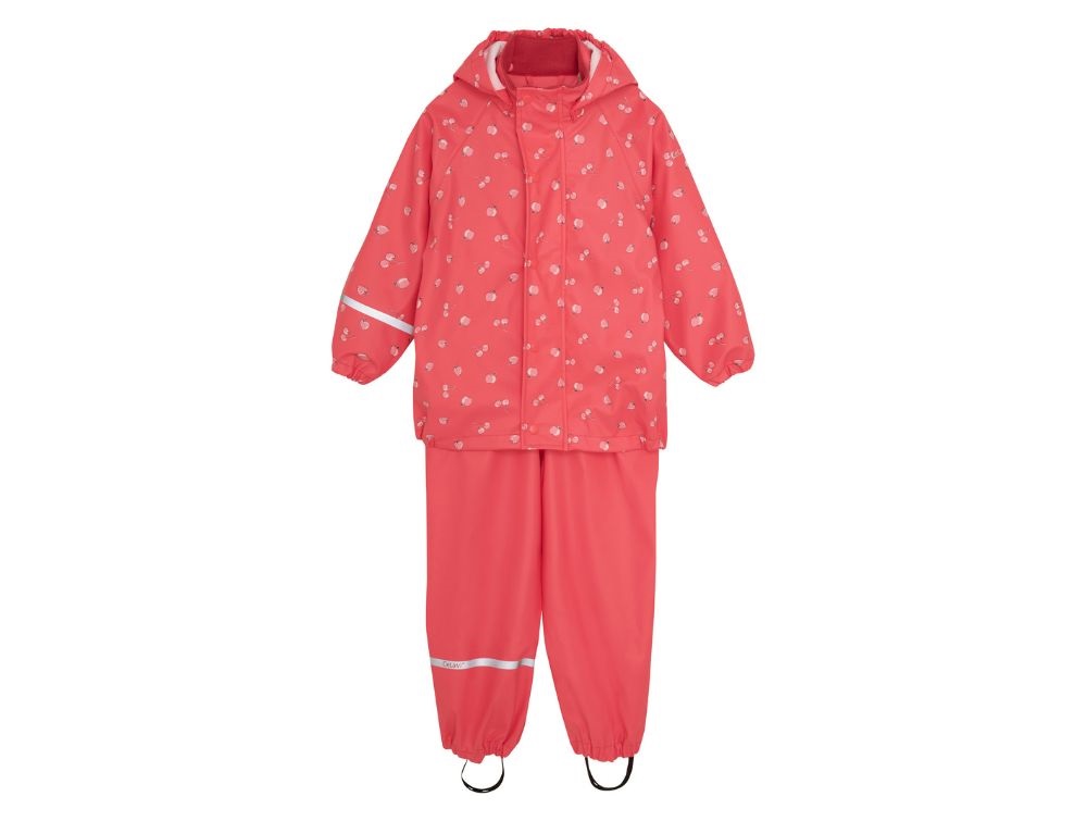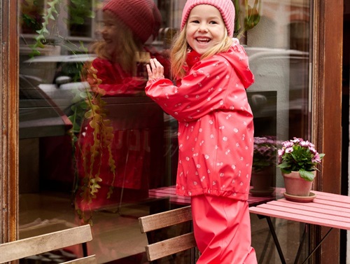 Regnsæt fra CeLaVi i rød (cayenne) med rosa frugtprint på jakken – jordbær, kirsebær og æbler.