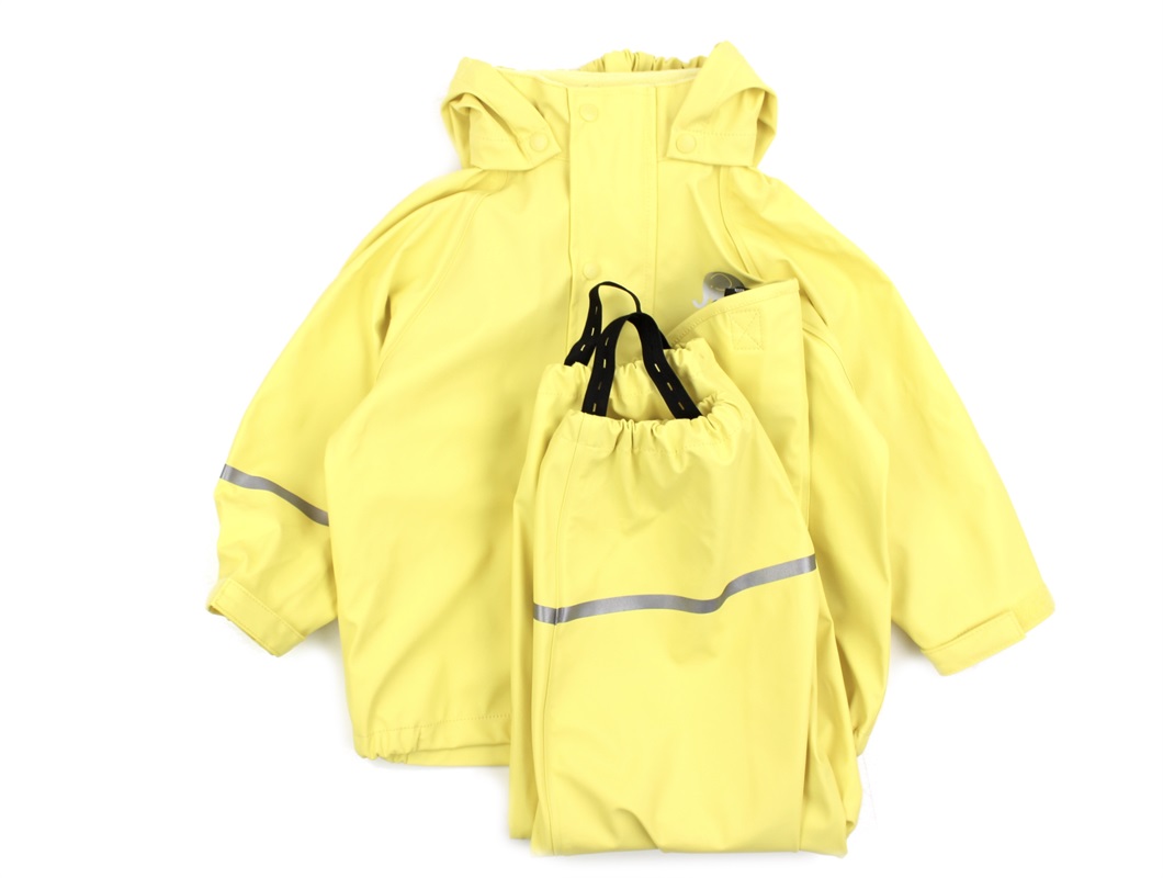 Regntøjssæt i farven sundress med bukser og jakke fra CeLavi. Regnsættet har et vandsøjletryk på 5000 mm og er vindtæt.