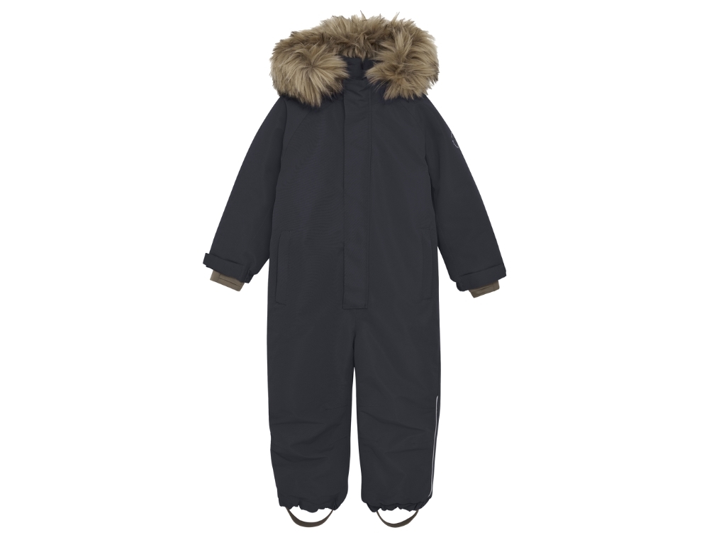 Flyverdragt i mørk nuance fra En Fant med aftagelig hætte med imiteret pelskant. Den har et højt vandsøjletryk, tapede sømme og har god åndbarhed.
