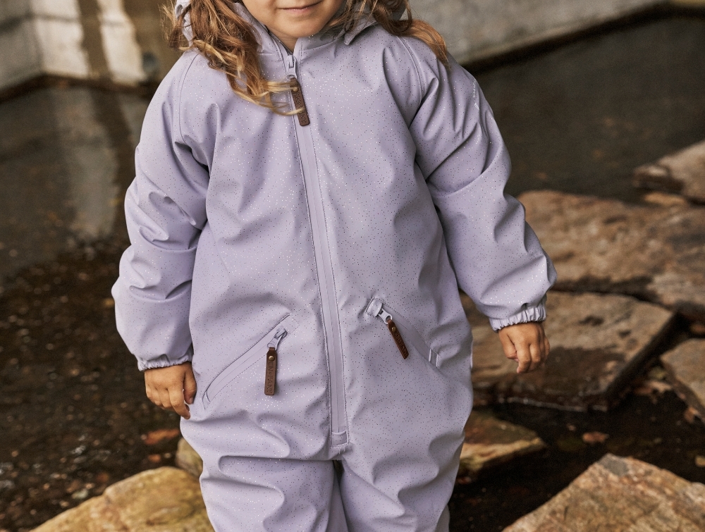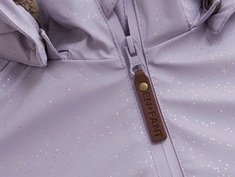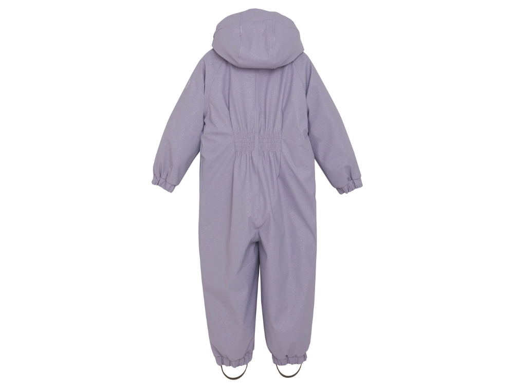 Gummiflyverdragt i lys lilla nuance fra En Fant med fine glimmerdetaljer. Dragten er perfekt til udendørs leg i efterårs- og vintersæsonen med sit vandtætte design og svejsede sømme, som holder barnet tørt i regn og sne.
