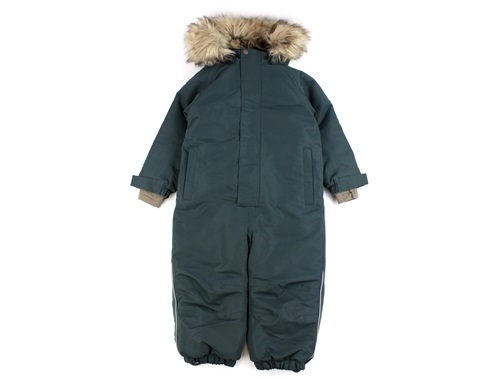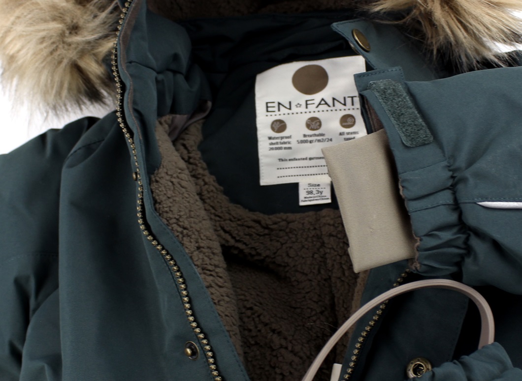 Flyverdragt i farven green gables fra En Fant. Flyverdragten har en aftagelig hætte med trykknapper. Pelsen (faux fur) og er også aftagelig.