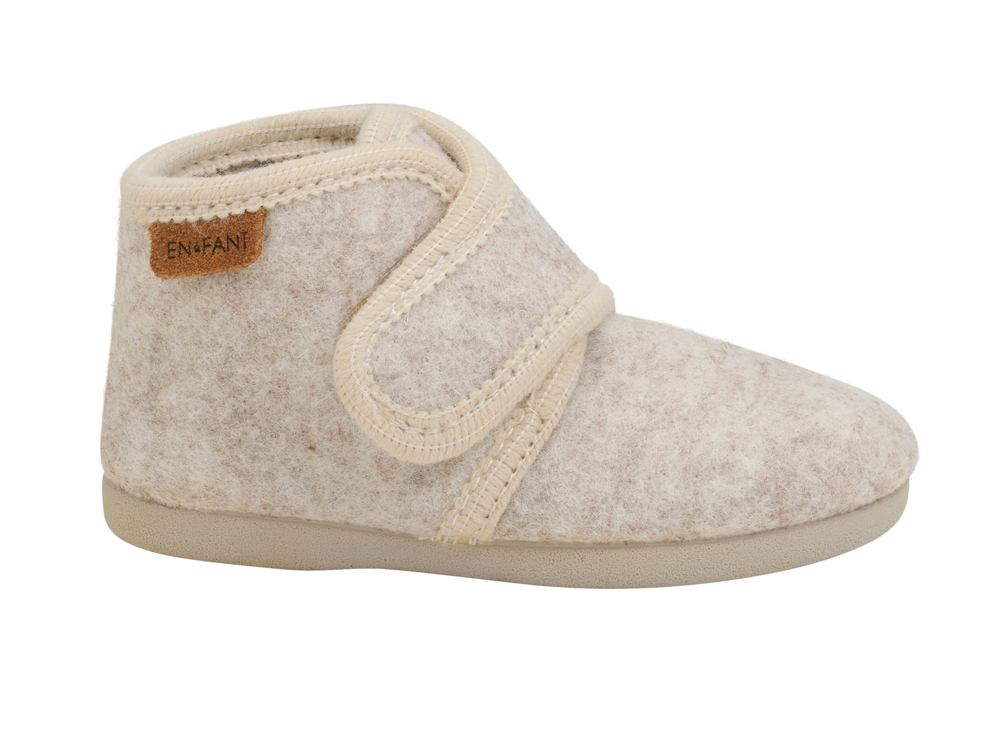 Ensfarvede uldfutter i råhvid (sand melange) fra En Fant. Futterne er fremstillet i 100% uld og har en super fleksibel og let gummisål, som samtidig er super praktisk til institutionen. De lukkes med en praktisk velcrorem over vristen, hvilket gør dem lette at tage af og på.