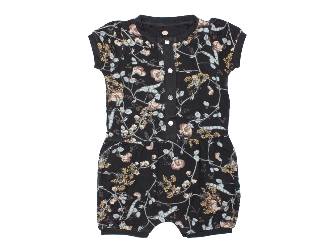 Jumpsuit med korte ærmer og ben fra En Fant. Buksedragten har fint blomsterprint og åbnes og lukkes med trykknapper.
