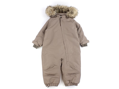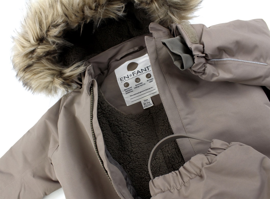 Flyverdragt i farven pine bark fra En Fant. Flyverdragten har en aftagelig hætte med trykknapper. Pelsen (faux fur) og er også aftagelig.