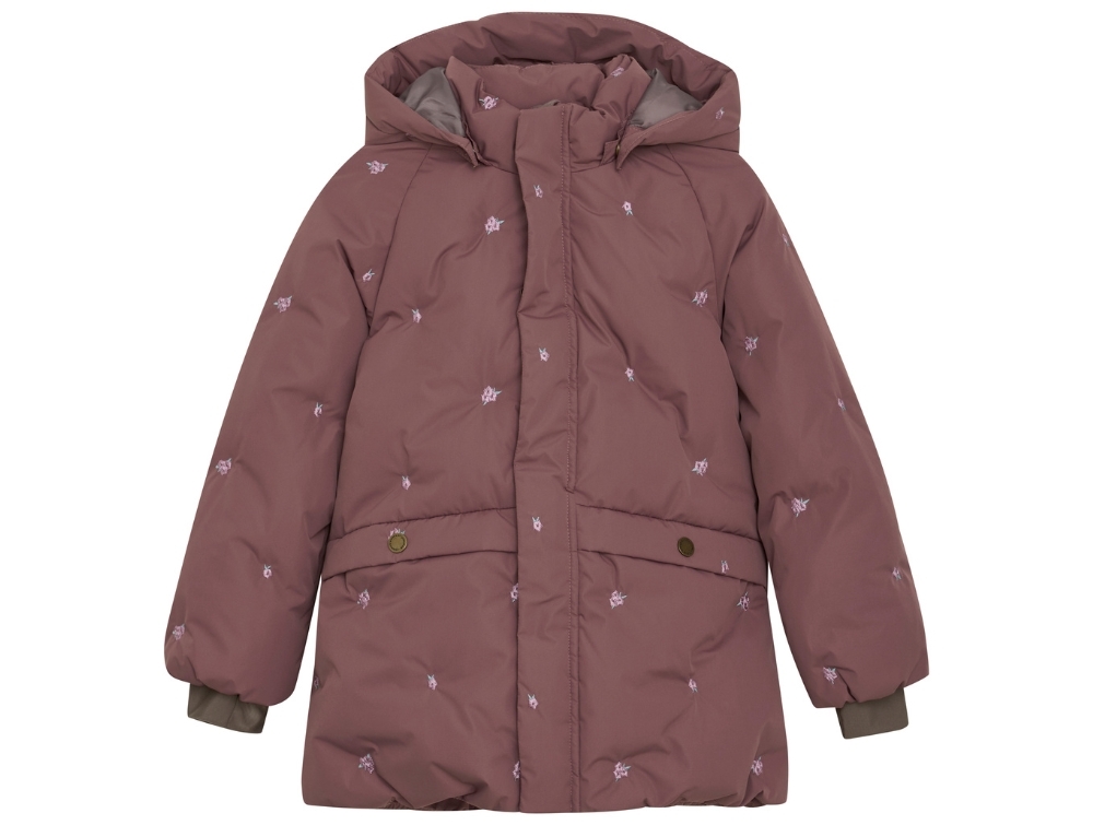 Pufferjakke i rose taupe fra En Fant med fine broderede blomster over hele jakken. Jakken er vandafvisende, åndbar og har aftagelig hætte.