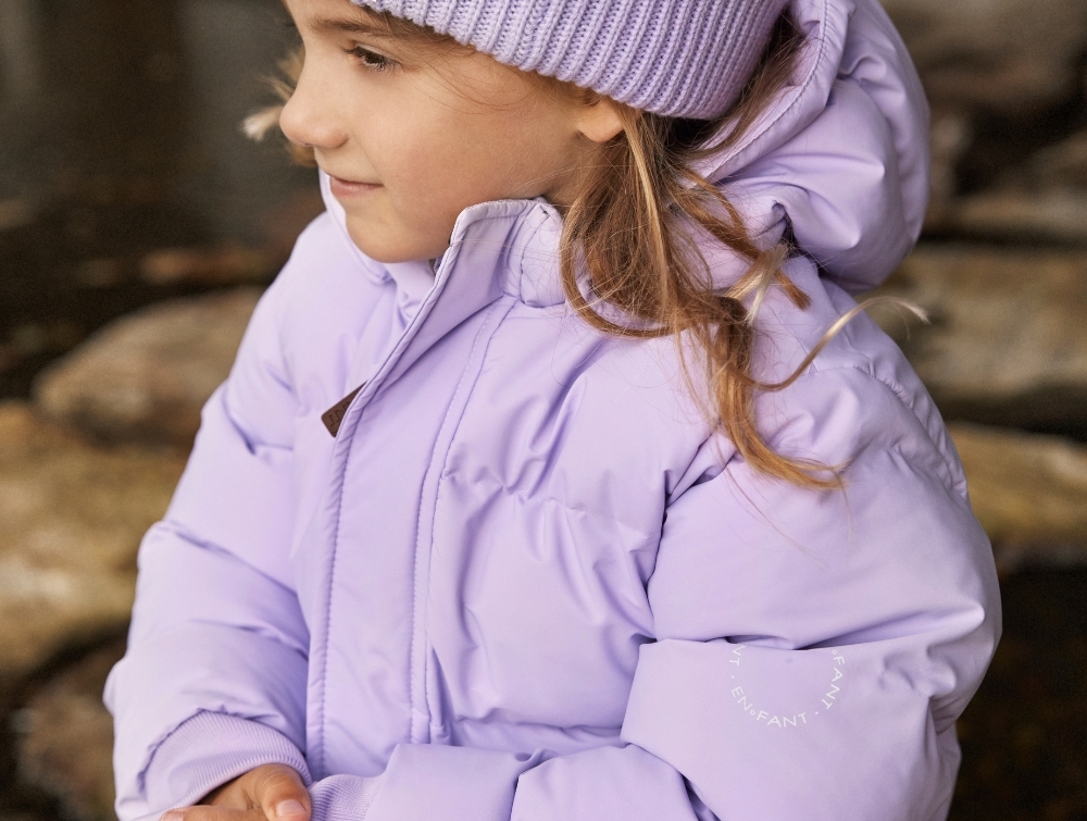 En Fant vinterjakke i lilla med quiltet design og praktiske detaljer