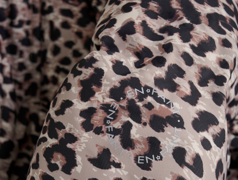 En Fant quiltet vinterjakke i beige nuance med leopardprint i brune og sorte toner. Jakken har vatteret design uden syninger på ydersiden for et glat og moderne look.