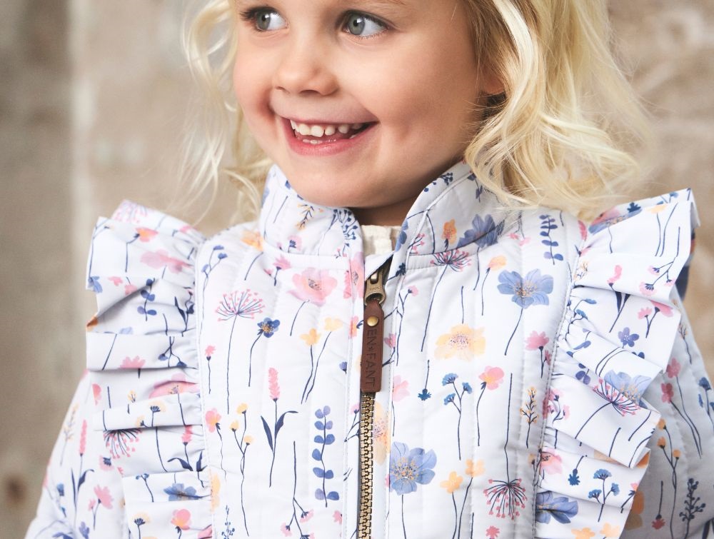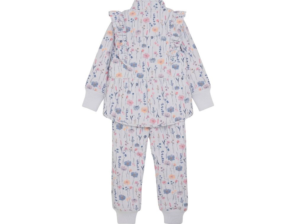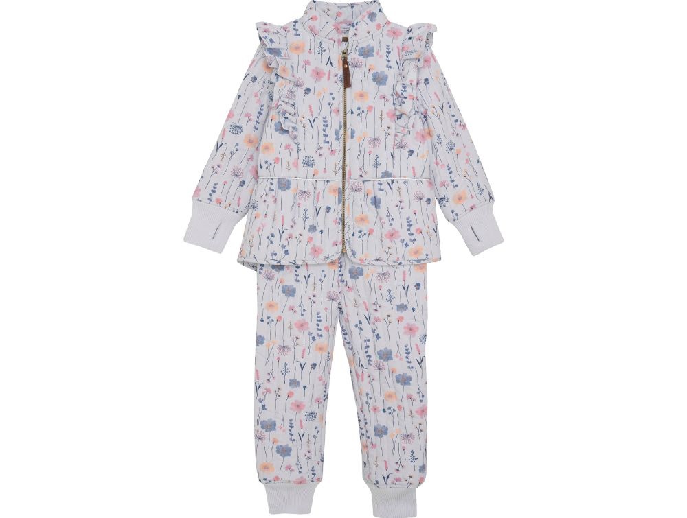 Dette termosæt fra En Fant kombinerer funktionalitet med et feminint udtryk. Sættet består af en jakke og bukser i en smuk lyseblå farve med fint blomsterprint.