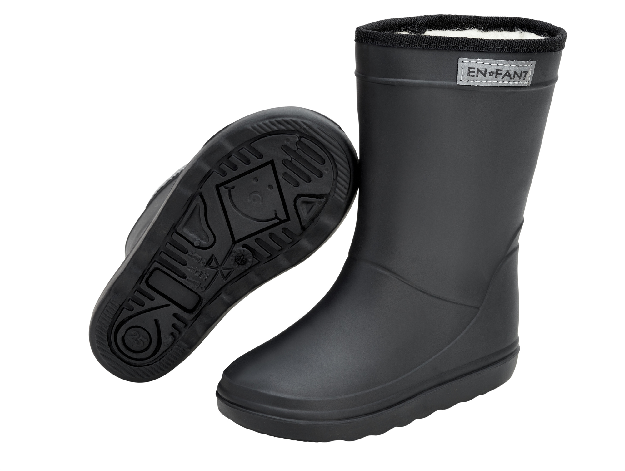 Sorte termogummistøvler fra En Fant med varmt uldfoer. Støvlerne er lavet af det lette termoplast-materiale MEGOLⓇ, som er slidstærkt, fleksibelt og 100% genanvendeligt. Indersålen har en isolerende aluminiumsmembran, der sammen med uldforet hjælper med at holde fødderne varme i kolde temperaturer. Støvlerne kan bruges som supplement til almindelige vinterstøvler og er ideelle til kolde, våde vinterdage.