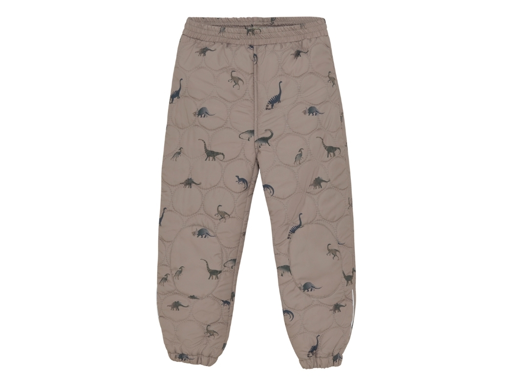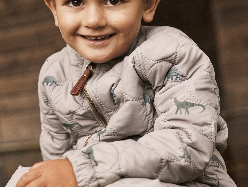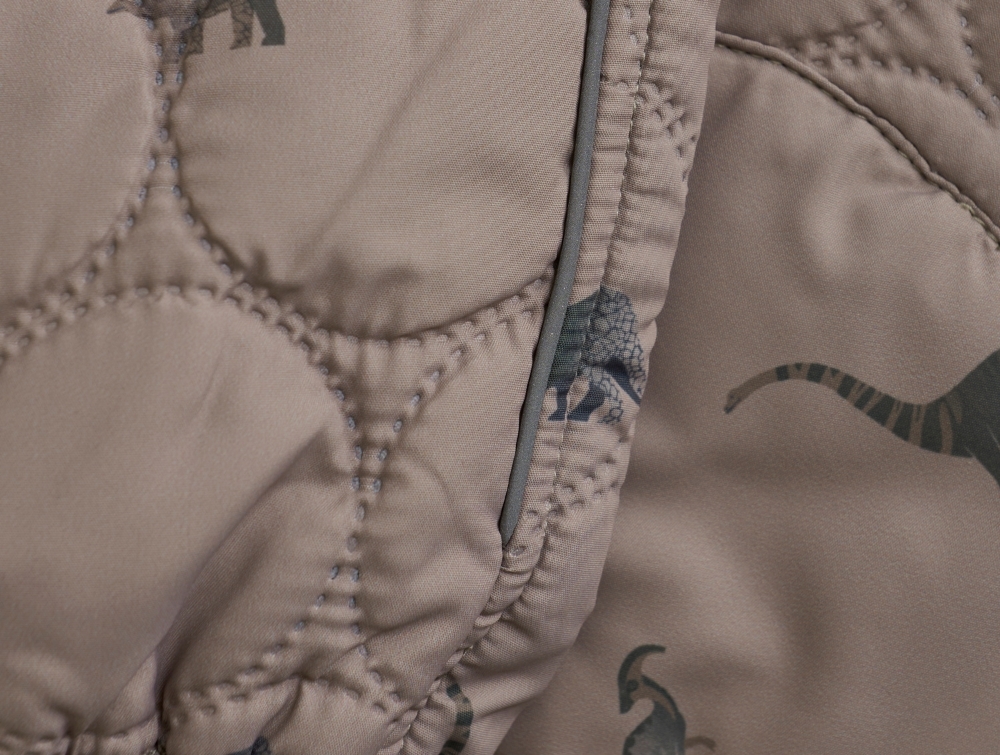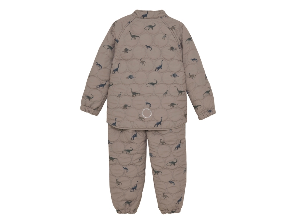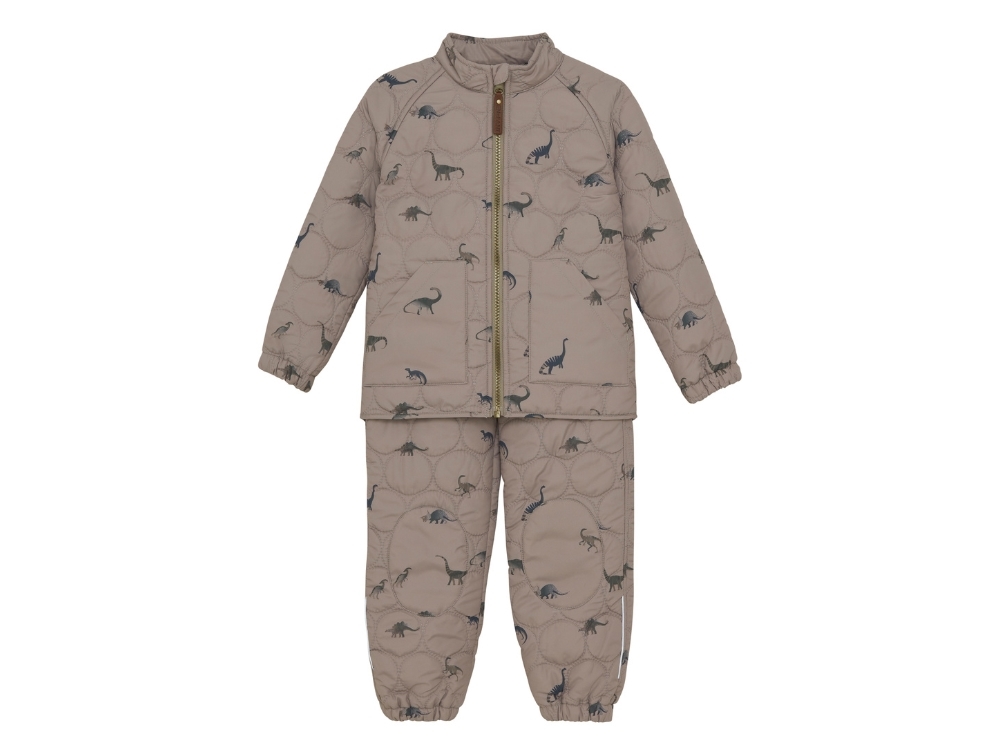 Termosættet består af en jakke og et par bukser i quiltet materiale med all-over dinosaurprint. Jakken har gennemgående lynlås, lomme på fronten og elastik i ærmekanterne. Bukserne har elastik i taljen og ved anklerne.