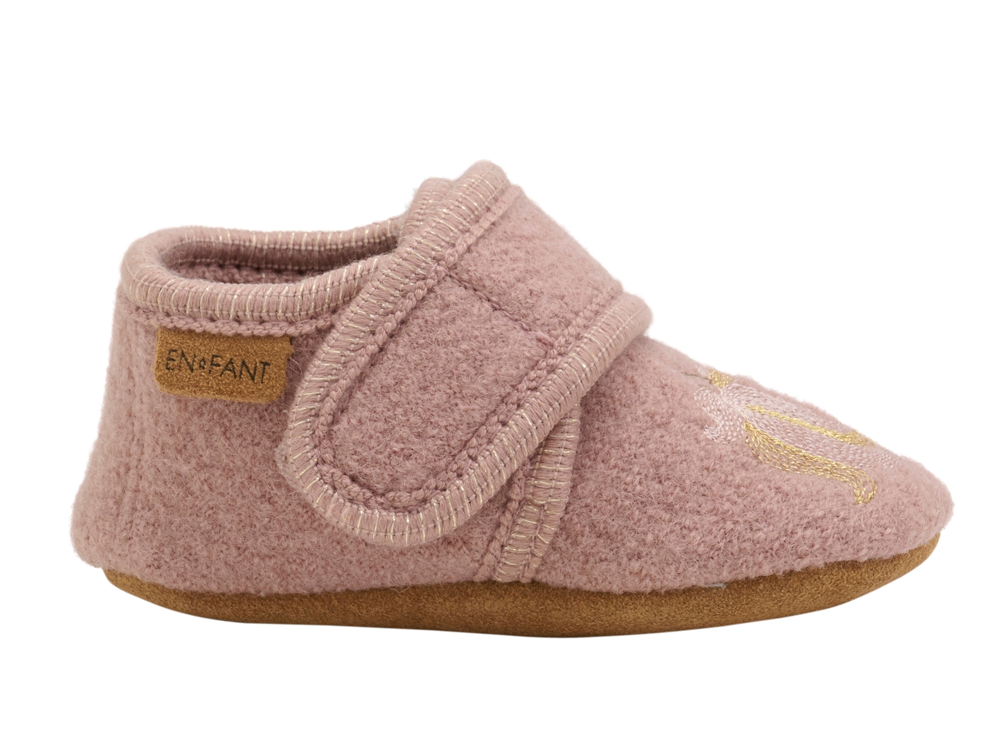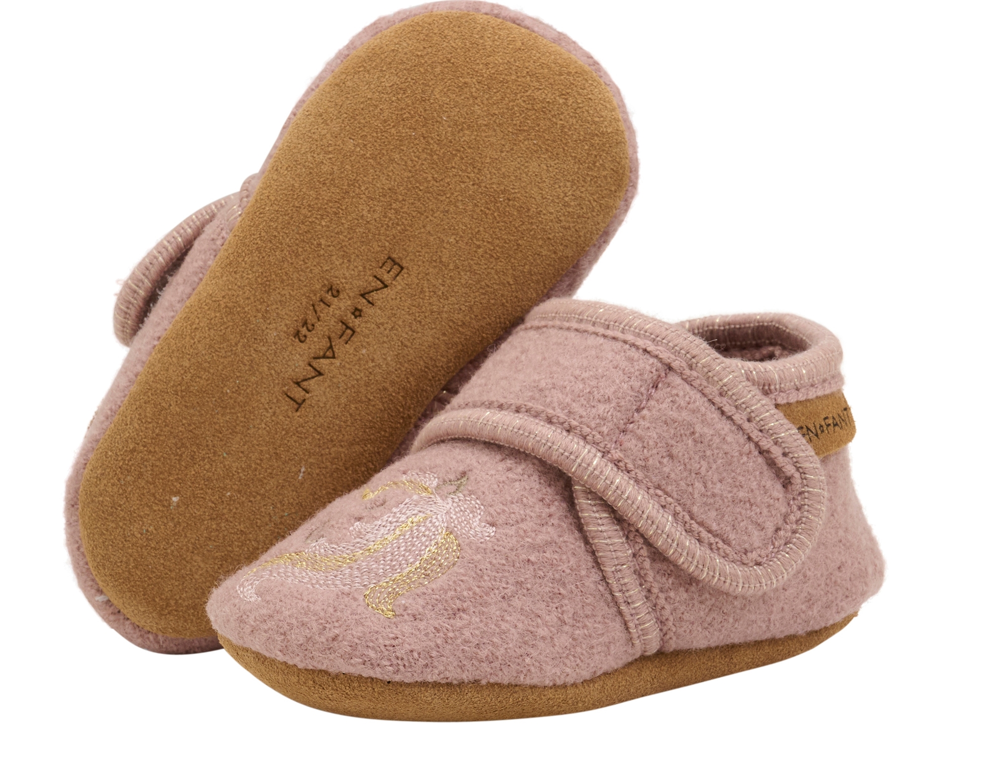 Rosa uldfutter fra En Fant med broderi af enhjørning på snuden. Futterne er fremstillet i 100% uld og har en blød ruskindssål, der giver godt fodfæste indendørs. De lukkes med en praktisk velcrorem over vristen, hvilket gør dem lette at tage af og på.