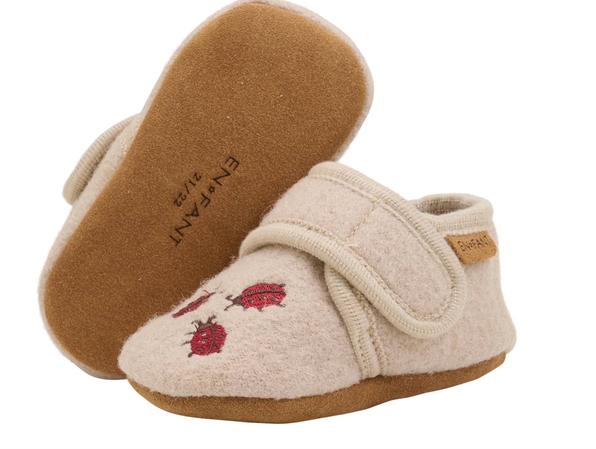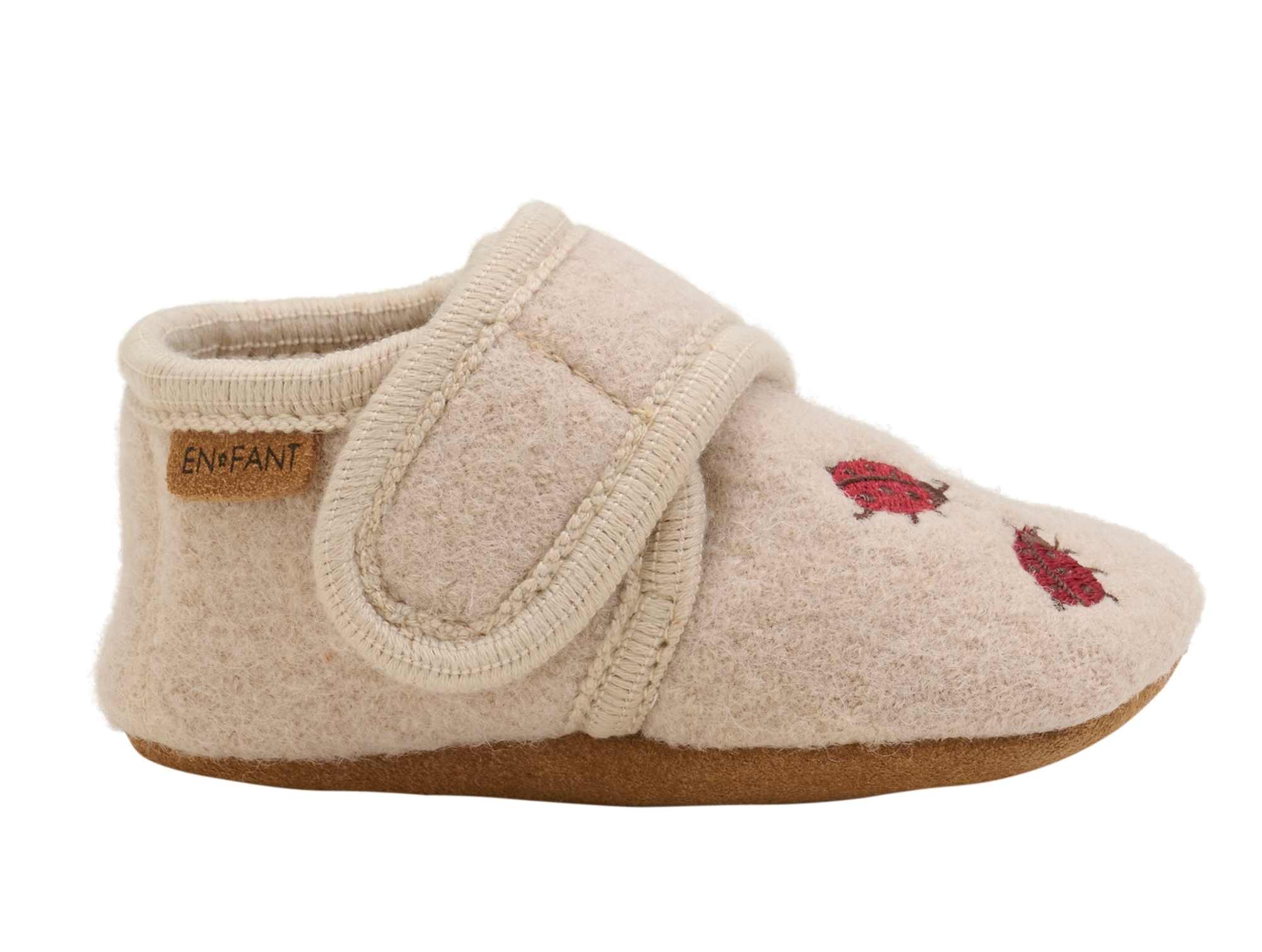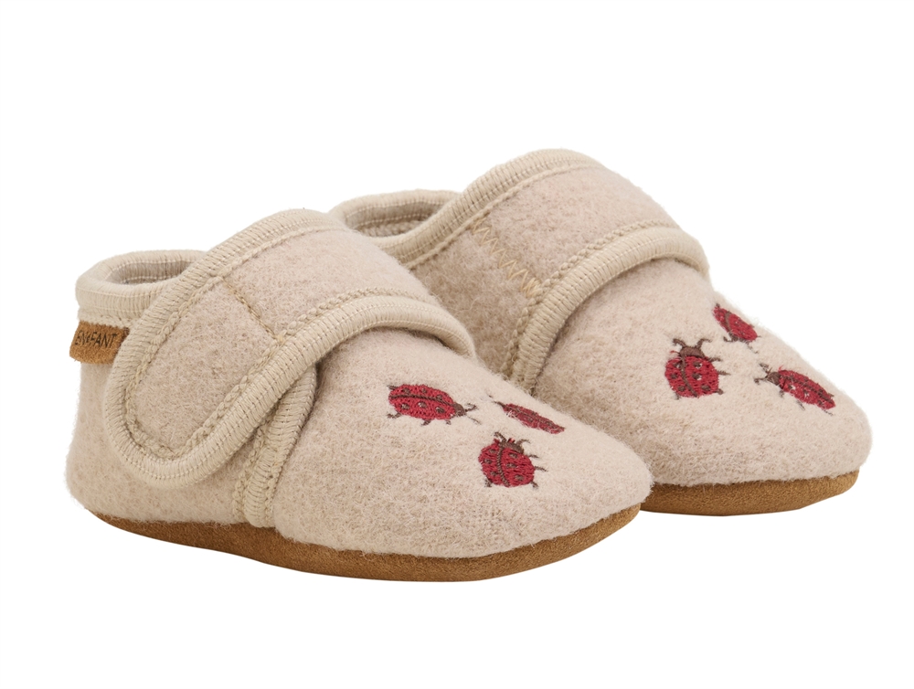 Sandfarvede uldfutter fra En Fant med broderi af røde mariehøner på snuden. Futterne er fremstillet i 100% uld og har en blød ruskindssål, der giver godt fodfæste indendørs. De lukkes med en praktisk velcrorem over vristen, hvilket gør dem lette at tage af og på.