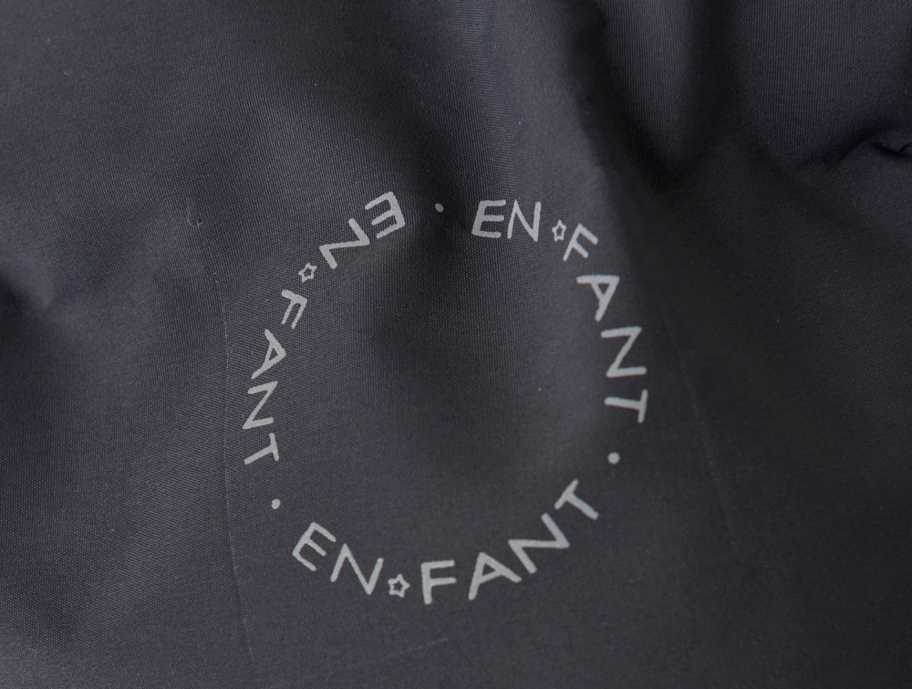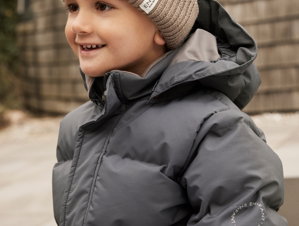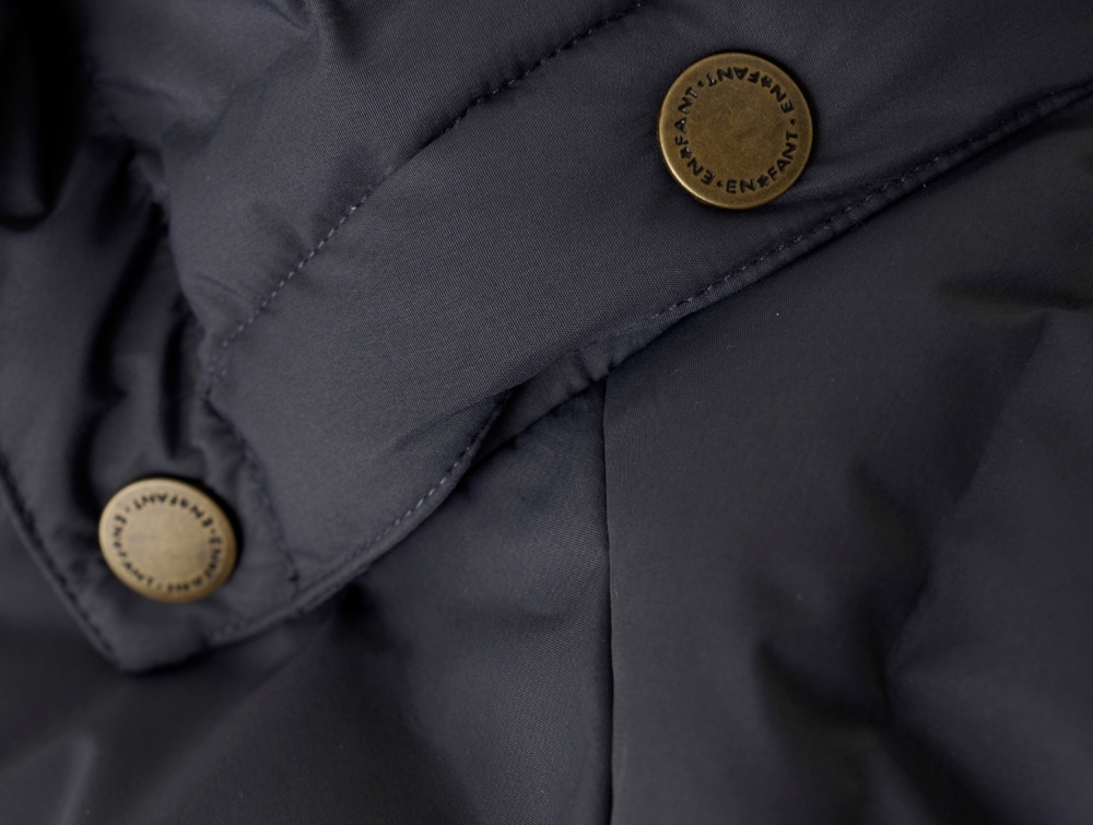 Den quiltede En Fant vinterjakke har en glat overflade og sømløse kanaler, der giver et enkelt og funktionelt design. Jakken har aftagelig hætte med trykknapper og en høj krave, der beskytter mod kulde. Foran er der sidelommer, og jakken lukkes med lynlås og trykknapper. På ærmet ses et diskret En Fant refleksprint.
