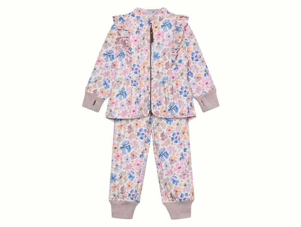 En Fant termosæt lys grå-rosa med blomsterprint og flæser