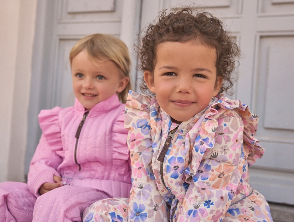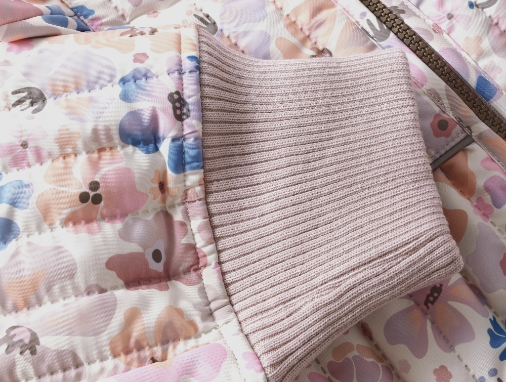 Termojakken har lynlås med hagebeskytter og er dekoreret med søde flæser på skuldrene. Den har stående krave, refleksdetalje på ryggen og brede ribmanchetter med hul til tommelfinger.