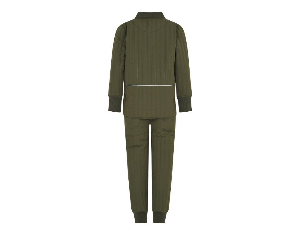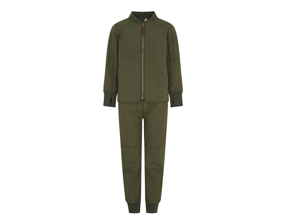 En Fant termosæt i grøn nuance er et let og funktionelt sæt med quiltet struktur, der egner sig til overgangsperioder. Sættet består af jakke og bukser med en almindelig pasform og en blød, let polstret kvalitet, som giver varme uden at fylde.
