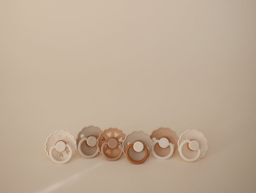 FRIGG ‘Cinnamon Charm’ er en 6-pak med runde sutter i varme naturinspirerede nuancer. Pakken indeholder både FRIGG Daisy og FRIGG Fairytale designs – alle med rund suttedel i naturgummi og en skånsom form, der minder om moderens bryst.