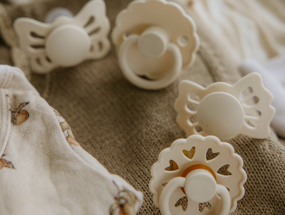 Mere information om FRIGG Baby’s første sut 4-pak floral heart cream