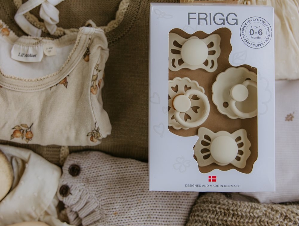 Suttepakke til nyfødte fra FRIGG i cremefarvet nuance. Sættet er udviklet til forældre, der ønsker at finde den sut, deres baby trives bedst med, og indeholder fire forskellige FRIGG-sutter med varierende sutteformer og materialer.