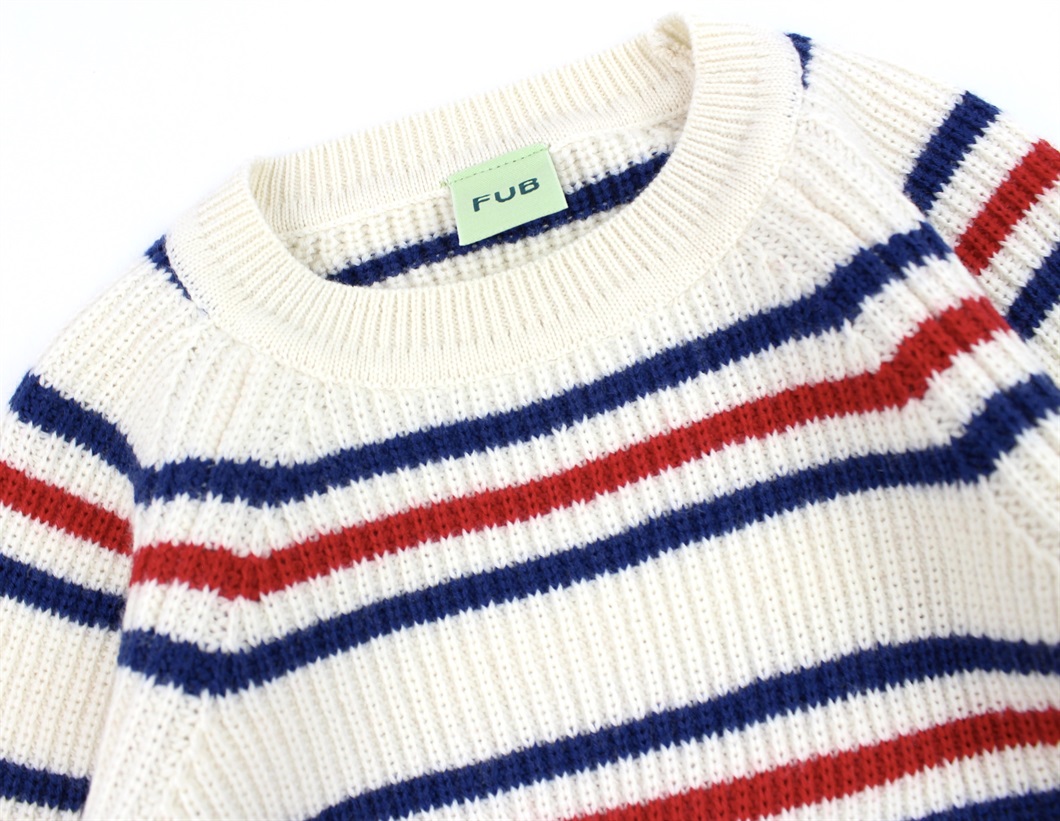 Stribet sweater i ren merinould fra FUB med ribstrikket krave, raglanærmer og en afslappet pasform.