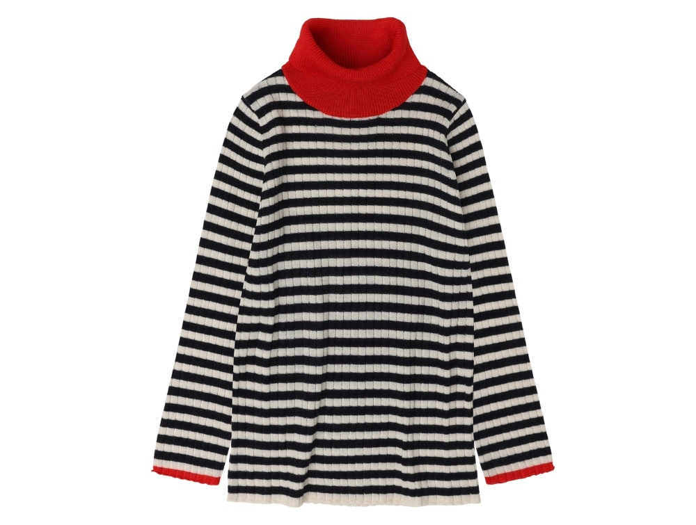 Rullekravebluse i ecru og mørkeblå striber fra FUB. En langærmet model med strikket ribstruktur og rød kontrast på krave og ærmekanter.
