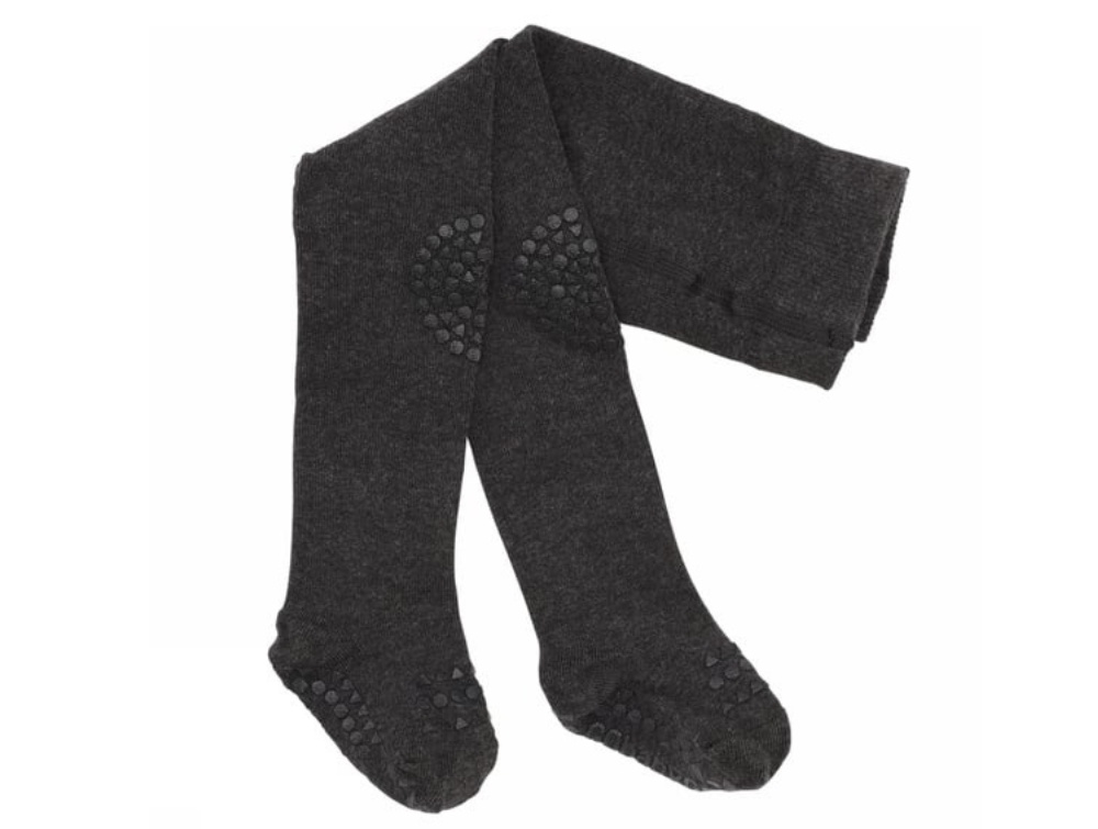 Kravlestrømpebukser i mørkegrå melange fra GoBabyGo. Designet med gummidutter på knæ, under fødderne og oven på tæerne, som giver barnet bedre greb, når det skal lære at kravle og gå.