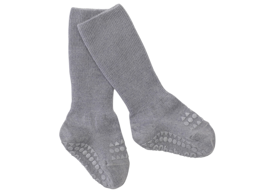 1 par skridsikre merinouldstrømper i grå melange fra GoBabyGo. Strømperne har skridsikre dutter under foden og på tæerne, der giver barnet stabilitet og hjælper med at forhindre glid på glatte overflader, når det lærer at kravle og gå.