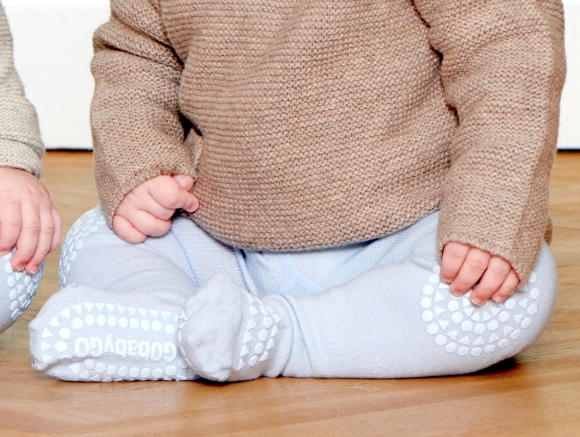 Strømpebukser i farven sky blue fra GoBabyGo. Strømpebukserne har gummidutter på knæ, under fødderne og på tæer, så barnet ikke glider, når det skal lære at kravle og gå.
