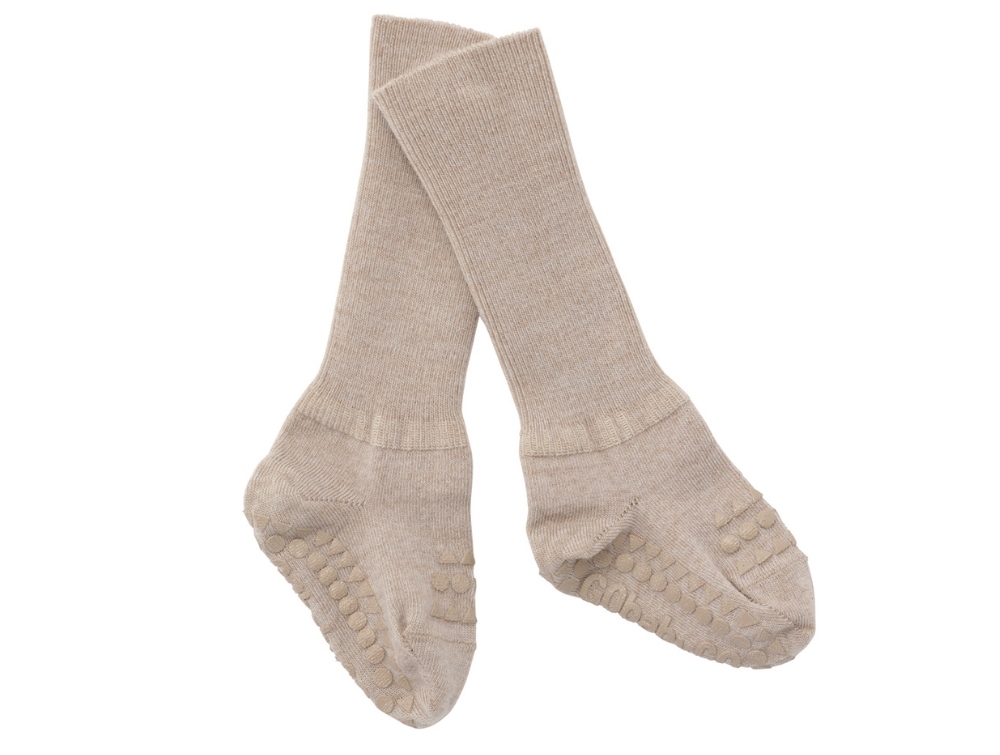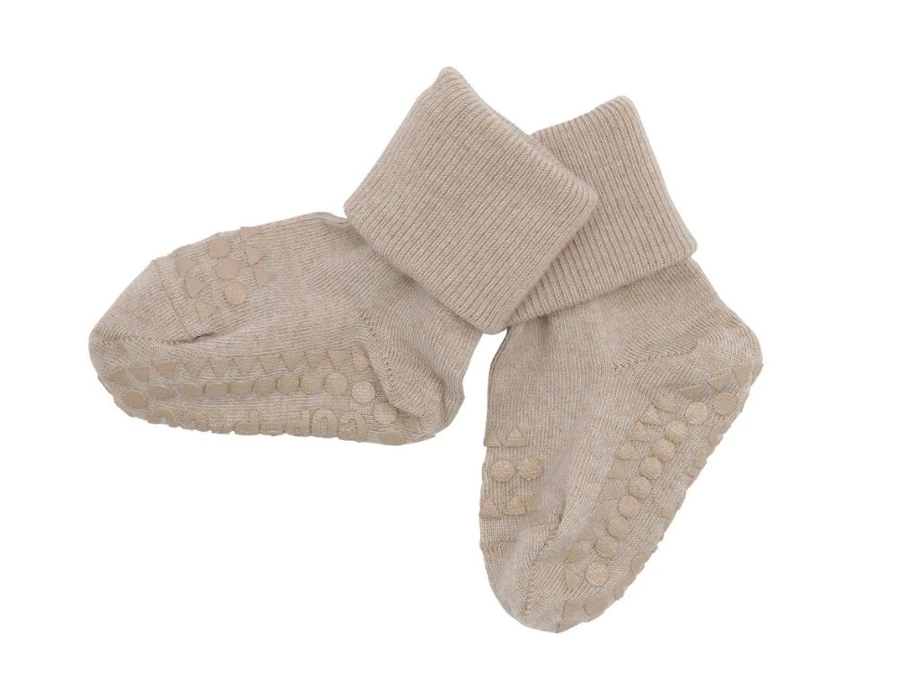 1 par skridsikre merinouldstrømper i sand fra GoBabyGo. Strømperne har skridsikre dutter under foden og på tæerne, der giver barnet stabilitet og hjælper med at forhindre glid på glatte overflader, når det lærer at kravle og gå.