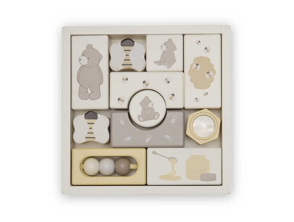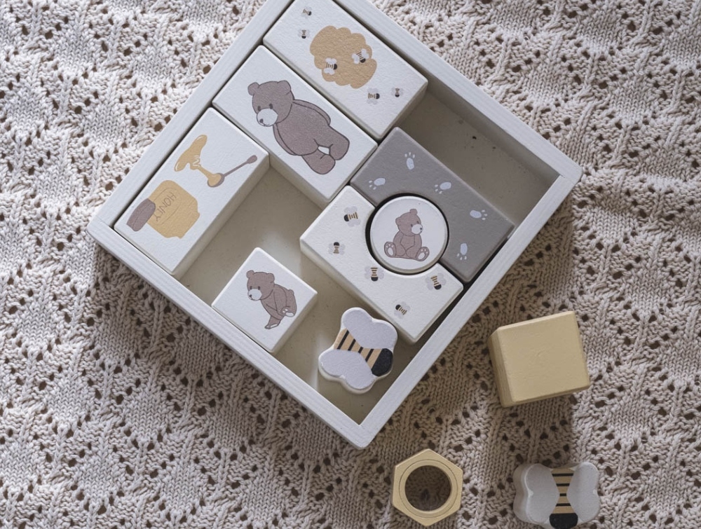 Alfie aktivitetsklodser i træ fra That's Mine med sødt motiv af bjørne, bier og honning. Klodserne er designet i rolige naturfarver og fremstillet i robust træ med glatte overflader, som små hænder nemt kan gribe om.