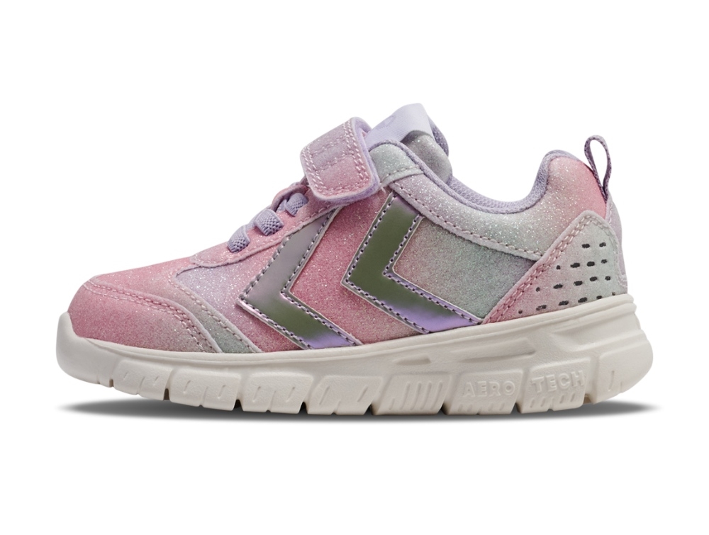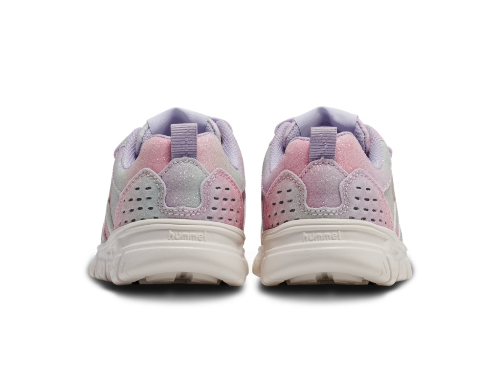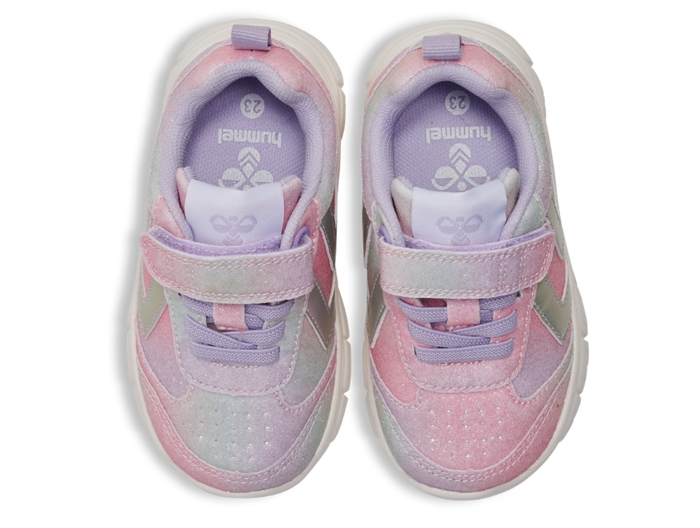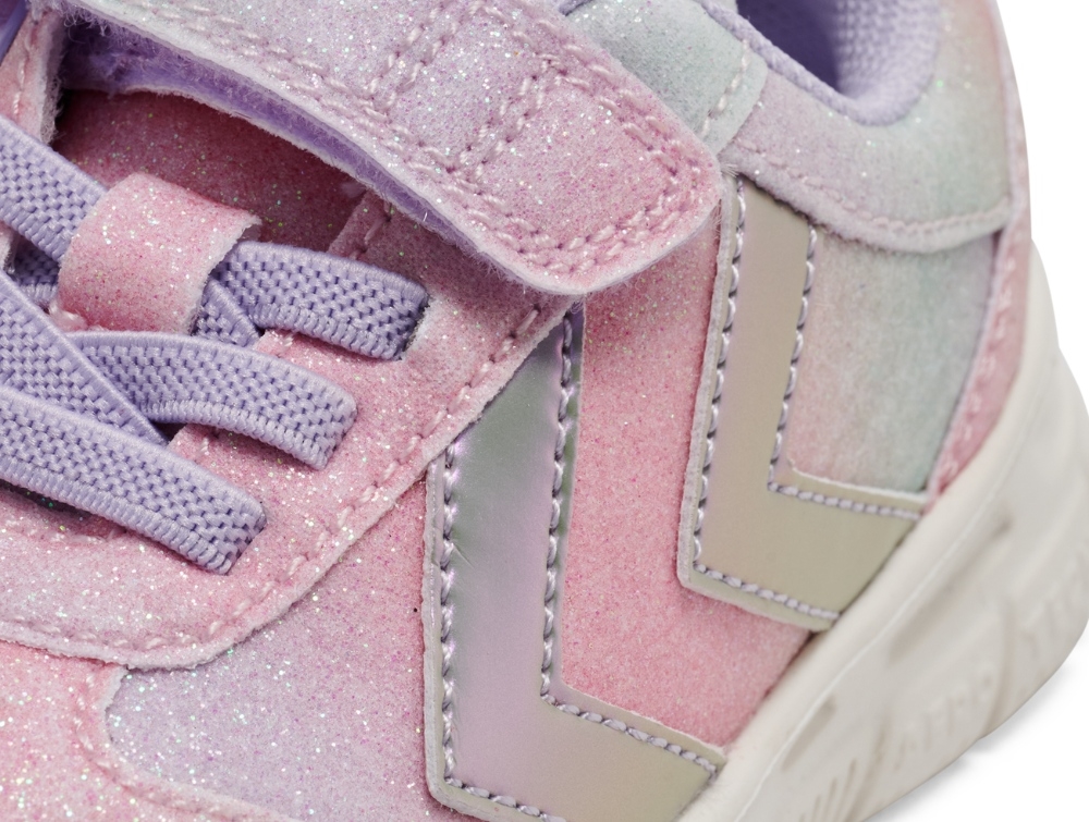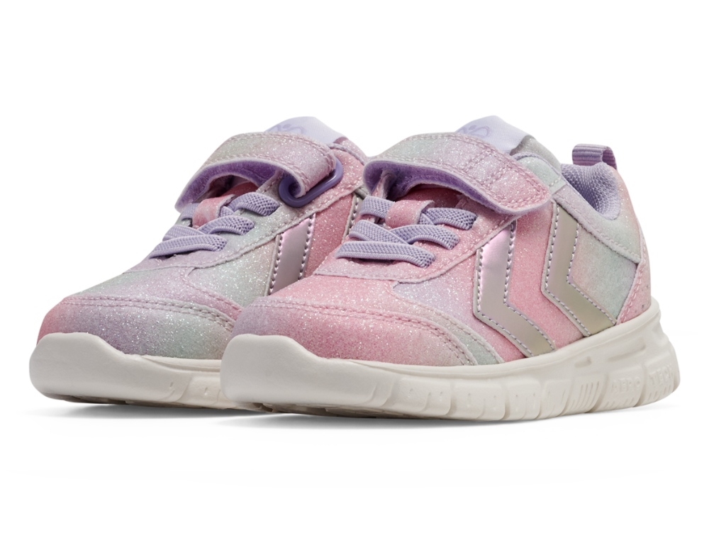 Sneaker med glimmer fra Hummel med farvespil i pastelfarver og glimmereffekt. Modellen Crosslite Glitter Infant har et let og fleksibelt design, der giver god bevægelsesfrihed til små fødder.