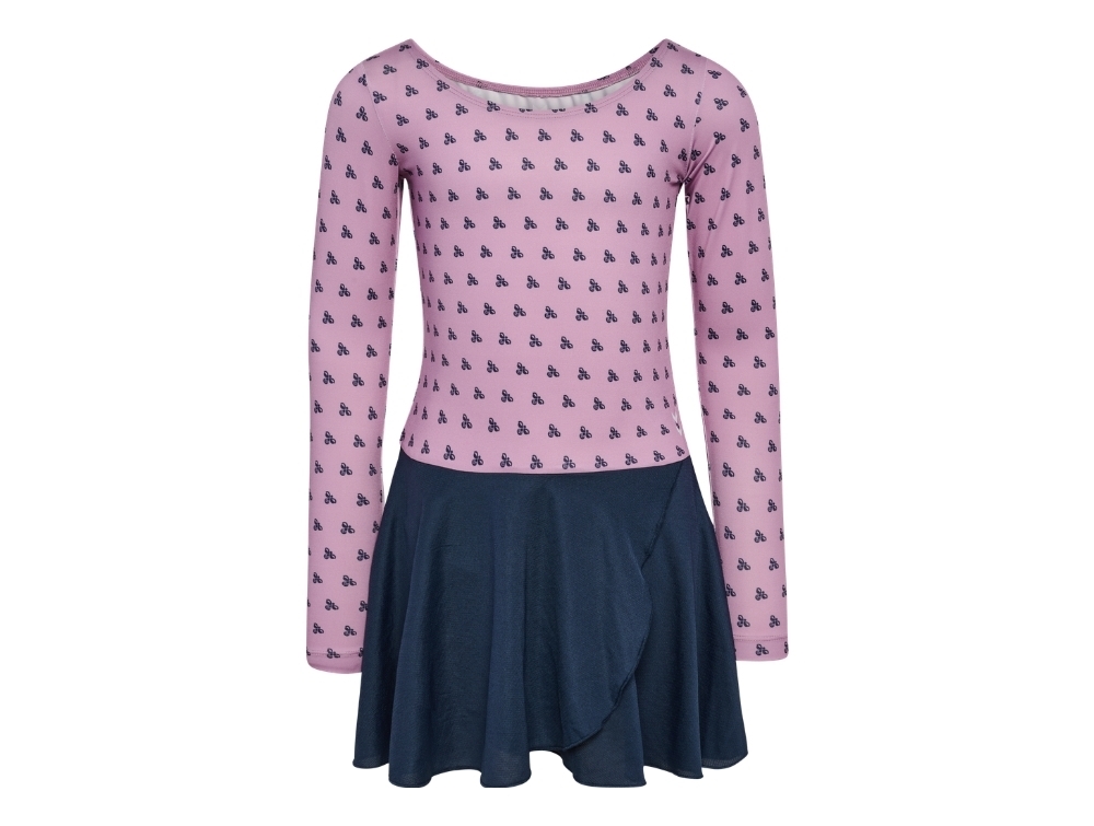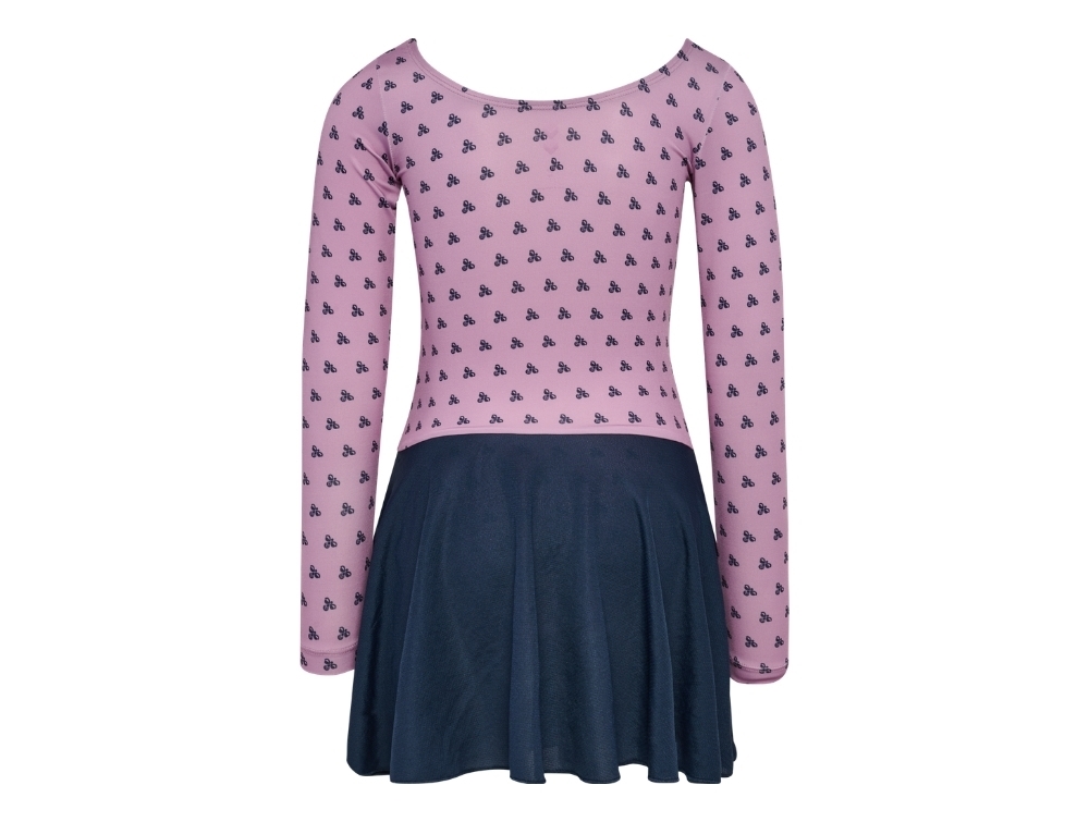 Gymnastikdragt i lilla nuance (lavender mist) fra Hummel med all-over print og mørkeblå nederdel.