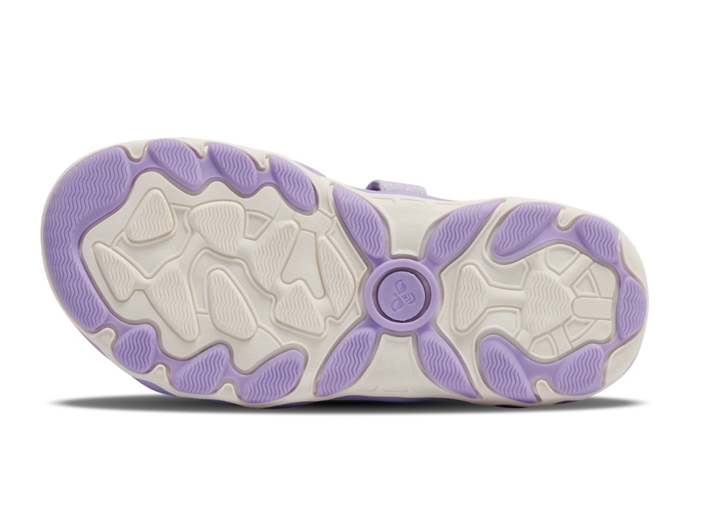 Sandal i lilla nuance fra Hummel med multifarvede remme i pink, mint og lilla samt fine glimmerdetaljer. Modellen har et farverigt og sommerligt udtryk, der skiller sig ud med sit bløde farvespil.
