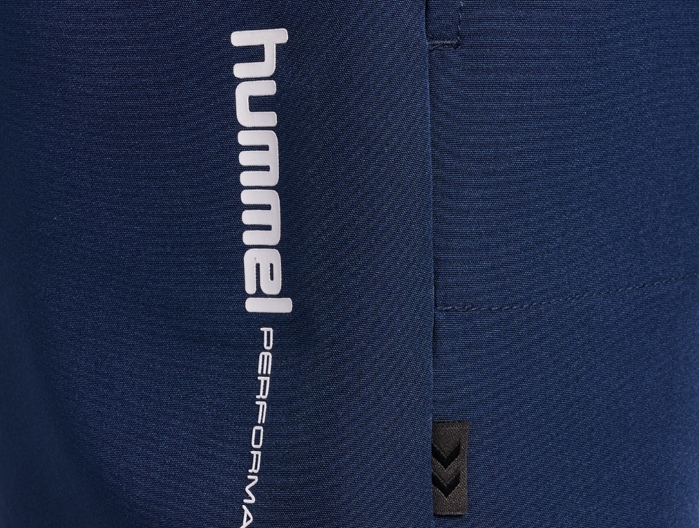 Modellen har elastik i taljen for en fleksibel pasform. På benet ses Hummels chevron logo detalje, som er en del af brandets velkendte design.