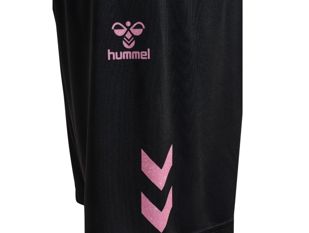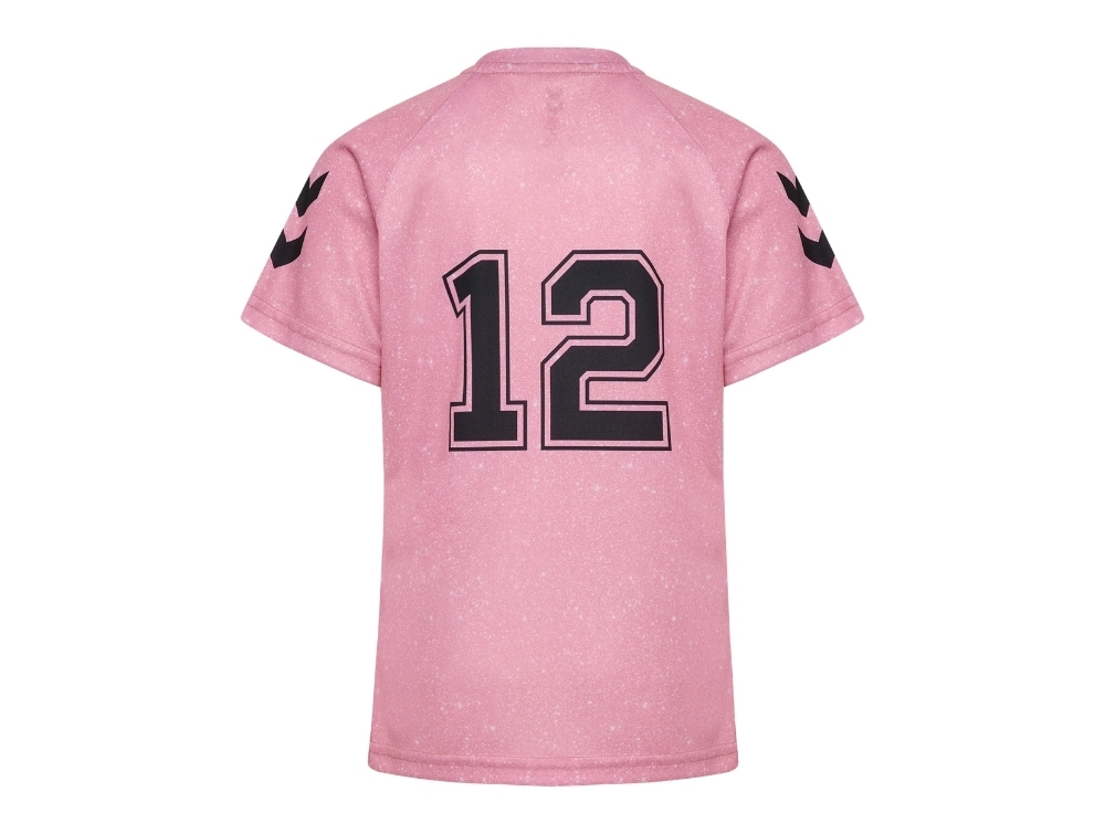 Hummel sportssæt i rosa med shimmerprint set forfraHummel sportssæt i rosa med hummel logo og detaljerHummel sportssæt i rosa med stort 12 print bagpåHummel shorts i sort med rosa vinkler