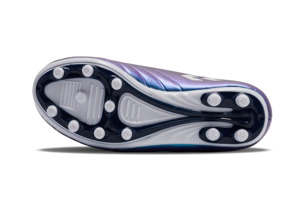 Støvlen er udstyret med elastiske snørebånd og en velcrorem over vristen, som gør den nem at tage af og på. Den formede overdel giver en tæt pasform omkring foden, mens knopsålen er udviklet til godt greb og stabilitet på græsbaner.