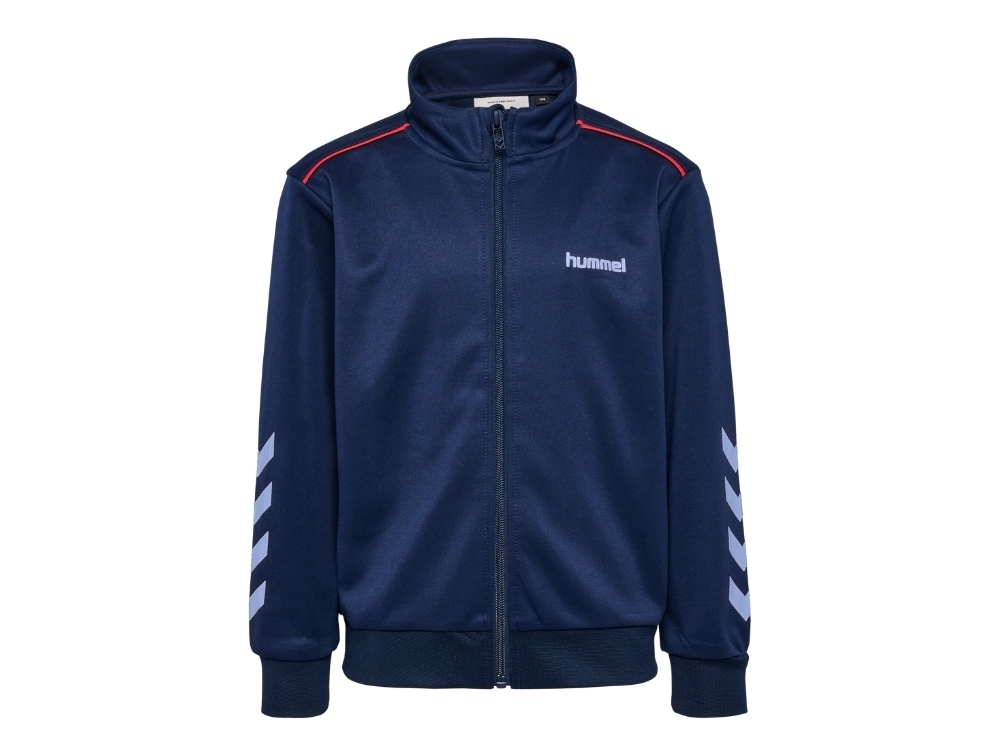 Hummel traeningssaet i moerkeblaa med roed piping set forfraHummel traeningsjakke i moerkeblaa med lynlaas og logoHummel traeningsjakke i moerkeblaa set bagfra med roed pipingHummel traeningsbukser i moerkeblaa med elastik i taljenHummel traeningsbukser i moerkeblaa set bagfra med chevron detaljer
